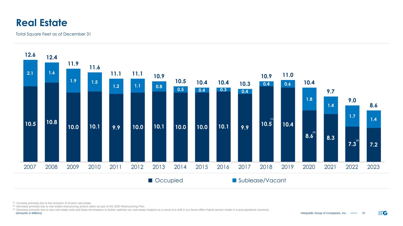 37Interpublic Group of Companies, Inc. (Amounts in Millions) Real Estate Total Square Feet as of December 31 Sublease/VacantOccupied (1) Increase primarily due to the inclusion of Acxiom real estate. (2) Decrease primarily due to real estate restructuring actions taken as part of the 2020 Restructuring Plan. (3) Decrease primarily due to new real estate exits and lease terminations to further optimize our real estate footprint as a result of a shift in our home-office hybrid service model in a post-pandemic economy. (1) (2) (3)