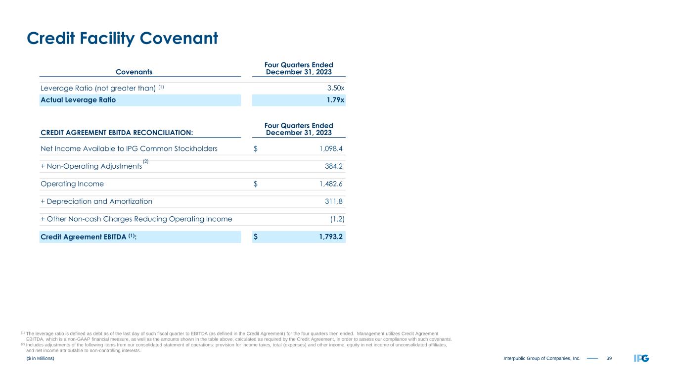 39Interpublic Group of Companies, Inc. Covenants Four Quarters Ended December 31, 2023 Leverage Ratio (not greater than) (1) 3.50x Actual Leverage Ratio 1.79x CREDIT AGREEMENT EBITDA RECONCILIATION: Four Quarters Ended December 31, 2023 Net Income Available to IPG Common Stockholders $ 1,098.4 + Non-Operating Adjustments 384.2 Operating Income $ 1,482.6 + Depreciation and Amortization 311.8 + Other Non-cash Charges Reducing Operating Income (1.2) Credit Agreement EBITDA (1): $ 1,793.2 ($ in Millions) Credit Facility Covenant (1) The leverage ratio is defined as debt as of the last day of such fiscal quarter to EBITDA (as defined in the Credit Agreement) for the four quarters then ended. Management utilizes Credit Agreement EBITDA, which is a non-GAAP financial measure, as well as the amounts shown in the table above, calculated as required by the Credit Agreement, in order to assess our compliance with such covenants. (2) Includes adjustments of the following items from our consolidated statement of operations: provision for income taxes, total (expenses) and other income, equity in net income of unconsolidated affiliates, and net income attributable to non-controlling interests. (2)