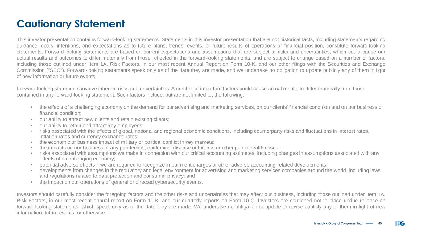 40Interpublic Group of Companies, Inc. This investor presentation contains forward-looking statements. Statements in this investor presentation that are not historical facts, including statements regarding guidance, goals, intentions, and expectations as to future plans, trends, events, or future results of operations or financial position, constitute forward-looking statements. Forward-looking statements are based on current expectations and assumptions that are subject to risks and uncertainties, which could cause our actual results and outcomes to differ materially from those reflected in the forward-looking statements, and are subject to change based on a number of factors, including those outlined under Item 1A, Risk Factors, in our most recent Annual Report on Form 10-K, and our other filings with the Securities and Exchange Commission ("SEC"). Forward-looking statements speak only as of the date they are made, and we undertake no obligation to update publicly any of them in light of new information or future events. Forward-looking statements involve inherent risks and uncertainties. A number of important factors could cause actual results to differ materially from those contained in any forward-looking statement. Such factors include, but are not limited to, the following: ▪ the effects of a challenging economy on the demand for our advertising and marketing services, on our clients’ financial condition and on our business or financial condition; ▪ our ability to attract new clients and retain existing clients; ▪ our ability to retain and attract key employees; ▪ risks associated with the effects of global, national and regional economic conditions, including counterparty risks and fluctuations in interest rates, inflation rates and currency exchange rates; ▪ the economic or business impact of military or political conflict in key markets; ▪ the impacts on our business of any pandemics, epidemics, disease outbreaks or other public health crises; ▪ risks associated with assumptions we make in connection with our critical accounting estimates, including changes in assumptions associated with any effects of a challenging economy; ▪ potential adverse effects if we are required to recognize impairment charges or other adverse accounting-related developments; ▪ developments from changes in the regulatory and legal environment for advertising and marketing services companies around the world, including laws and regulations related to data protection and consumer privacy; and ▪ the impact on our operations of general or directed cybersecurity events. Investors should carefully consider the foregoing factors and the other risks and uncertainties that may affect our business, including those outlined under Item 1A, Risk Factors, in our most recent annual report on Form 10-K, and our quarterly reports on Form 10-Q. Investors are cautioned not to place undue reliance on forward-looking statements, which speak only as of the date they are made. We undertake no obligation to update or revise publicly any of them in light of new information, future events, or otherwise. Cautionary Statement