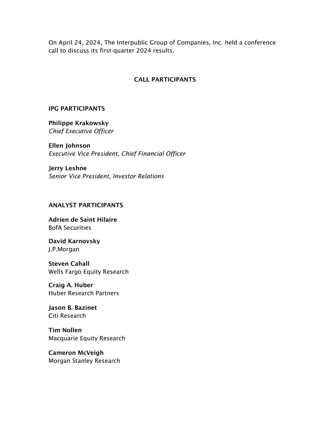 On April 24, 2024, The Interpublic Group of Companies, Inc. held a conference call to discuss its first-quarter 2024 results. CALL PARTICIPANTS IPG PARTICIPANTS Philippe Krakowsky Chief Executive Officer Ellen Johnson Executive Vice President, Chief Financial Officer Jerry Leshne Senior Vice President, Investor Relations ANALYST PARTICIPANTS Adrien de Saint Hilaire BofA Securities David Karnovsky J.P.Morgan Steven Cahall Wells Fargo Equity Research Craig A. Huber Huber Research Partners Jason B. Bazinet Citi Research Tim Nollen Macquarie Equity Research Cameron McVeigh Morgan Stanley Research