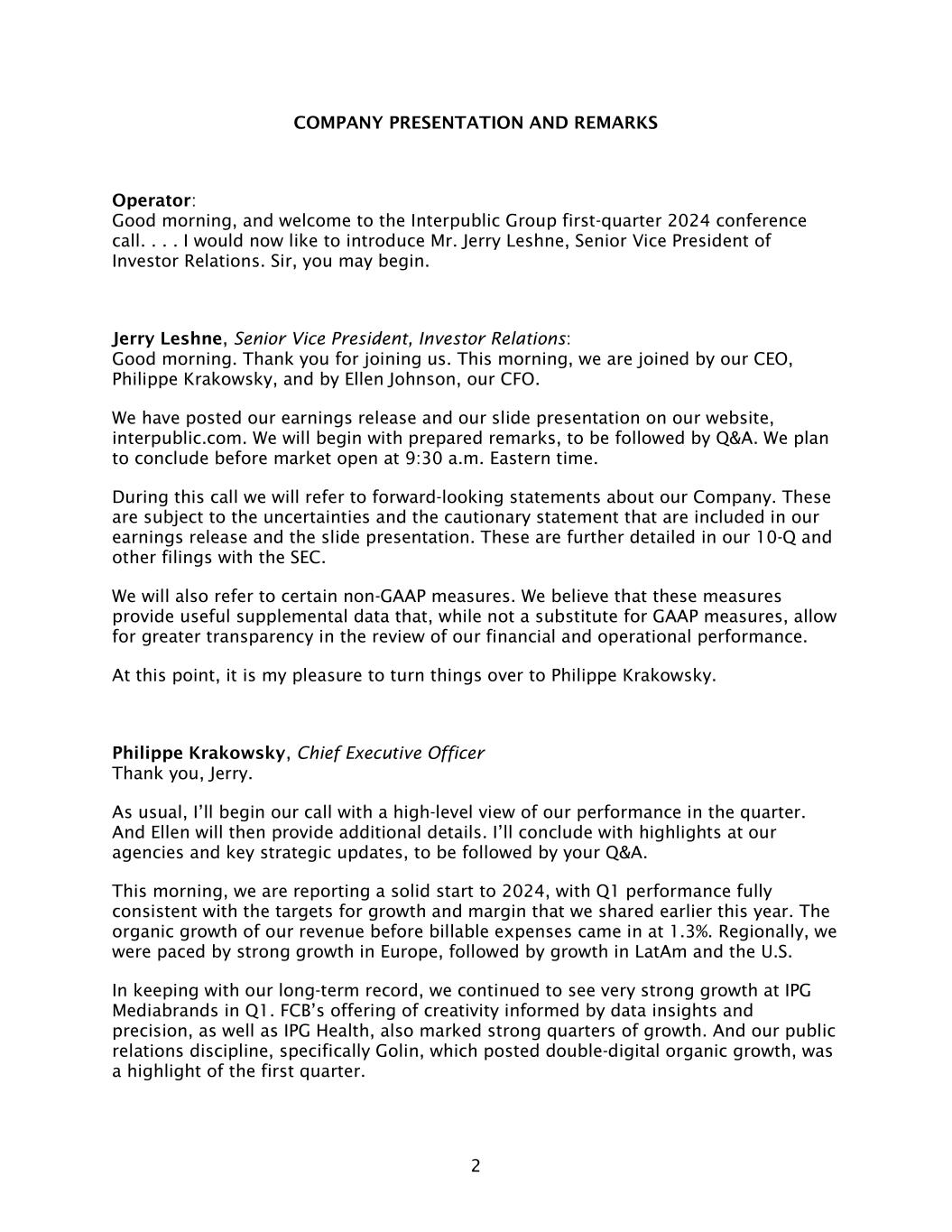 2 COMPANY PRESENTATION AND REMARKS Operator: Good morning, and welcome to the Interpublic Group first-quarter 2024 conference call. . . . I would now like to introduce Mr. Jerry Leshne, Senior Vice President of Investor Relations. Sir, you may begin. Jerry Leshne, Senior Vice President, Investor Relations: Good morning. Thank you for joining us. This morning, we are joined by our CEO, Philippe Krakowsky, and by Ellen Johnson, our CFO. We have posted our earnings release and our slide presentation on our website, interpublic.com. We will begin with prepared remarks, to be followed by Q&A. We plan to conclude before market open at 9:30 a.m. Eastern time. During this call we will refer to forward-looking statements about our Company. These are subject to the uncertainties and the cautionary statement that are included in our earnings release and the slide presentation. These are further detailed in our 10-Q and other filings with the SEC. We will also refer to certain non-GAAP measures. We believe that these measures provide useful supplemental data that, while not a substitute for GAAP measures, allow for greater transparency in the review of our financial and operational performance. At this point, it is my pleasure to turn things over to Philippe Krakowsky. Philippe Krakowsky, Chief Executive Officer Thank you, Jerry. As usual, I’ll begin our call with a high-level view of our performance in the quarter. And Ellen will then provide additional details. I’ll conclude with highlights at our agencies and key strategic updates, to be followed by your Q&A. This morning, we are reporting a solid start to 2024, with Q1 performance fully consistent with the targets for growth and margin that we shared earlier this year. The organic growth of our revenue before billable expenses came in at 1.3%. Regionally, we were paced by strong growth in Europe, followed by growth in LatAm and the U.S. In keeping with our long-term record, we continued to see very strong growth at IPG Mediabrands in Q1. FCB’s offering of creativity informed by data insights and precision, as well as IPG Health, also marked strong quarters of growth. And our public relations discipline, specifically Golin, which posted double-digital organic growth, was a highlight of the first quarter.