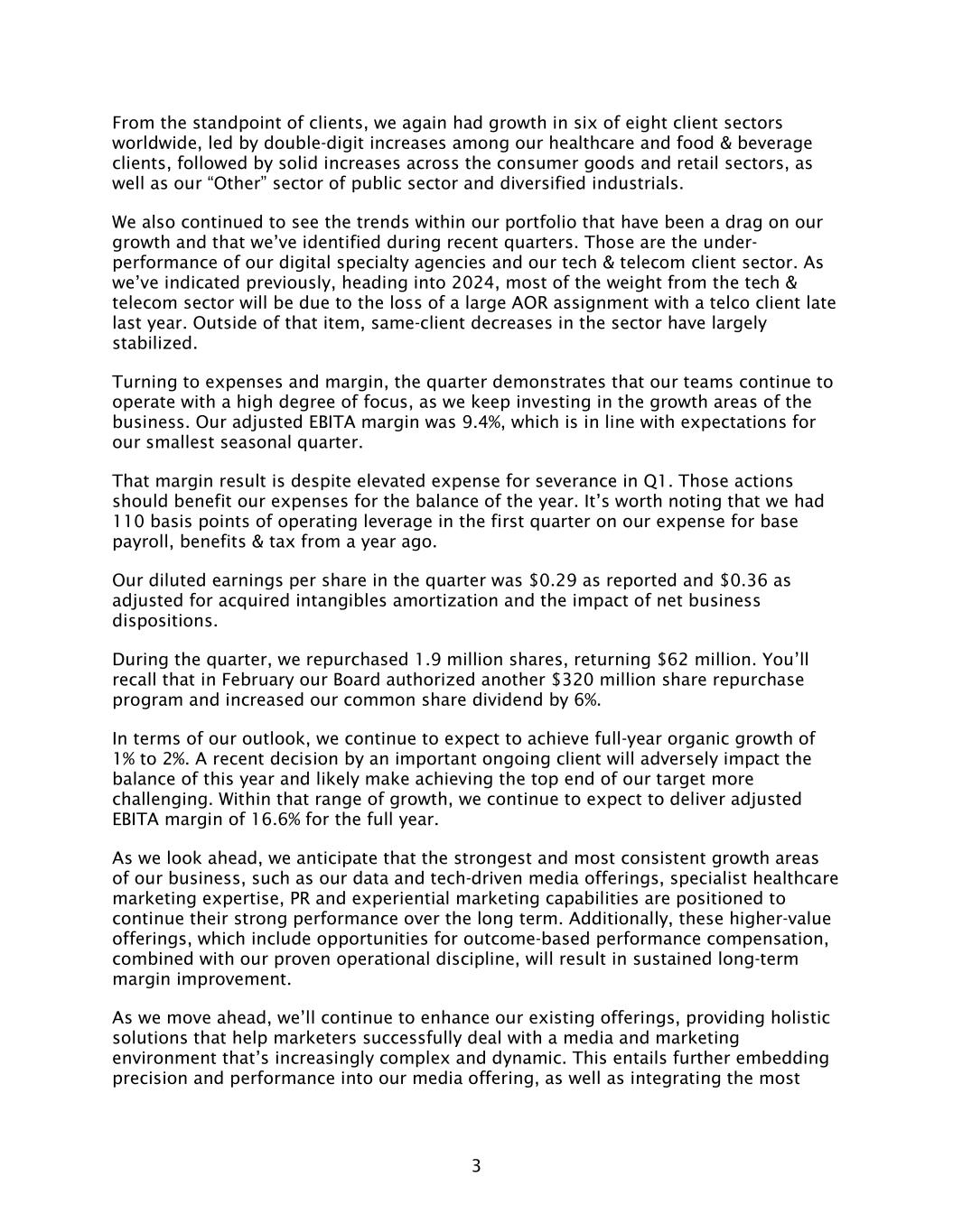 3 From the standpoint of clients, we again had growth in six of eight client sectors worldwide, led by double-digit increases among our healthcare and food & beverage clients, followed by solid increases across the consumer goods and retail sectors, as well as our “Other” sector of public sector and diversified industrials. We also continued to see the trends within our portfolio that have been a drag on our growth and that we’ve identified during recent quarters. Those are the under- performance of our digital specialty agencies and our tech & telecom client sector. As we’ve indicated previously, heading into 2024, most of the weight from the tech & telecom sector will be due to the loss of a large AOR assignment with a telco client late last year. Outside of that item, same-client decreases in the sector have largely stabilized. Turning to expenses and margin, the quarter demonstrates that our teams continue to operate with a high degree of focus, as we keep investing in the growth areas of the business. Our adjusted EBITA margin was 9.4%, which is in line with expectations for our smallest seasonal quarter. That margin result is despite elevated expense for severance in Q1. Those actions should benefit our expenses for the balance of the year. It’s worth noting that we had 110 basis points of operating leverage in the first quarter on our expense for base payroll, benefits & tax from a year ago. Our diluted earnings per share in the quarter was $0.29 as reported and $0.36 as adjusted for acquired intangibles amortization and the impact of net business dispositions. During the quarter, we repurchased 1.9 million shares, returning $62 million. You’ll recall that in February our Board authorized another $320 million share repurchase program and increased our common share dividend by 6%. In terms of our outlook, we continue to expect to achieve full-year organic growth of 1% to 2%. A recent decision by an important ongoing client will adversely impact the balance of this year and likely make achieving the top end of our target more challenging. Within that range of growth, we continue to expect to deliver adjusted EBITA margin of 16.6% for the full year. As we look ahead, we anticipate that the strongest and most consistent growth areas of our business, such as our data and tech-driven media offerings, specialist healthcare marketing expertise, PR and experiential marketing capabilities are positioned to continue their strong performance over the long term. Additionally, these higher-value offerings, which include opportunities for outcome-based performance compensation, combined with our proven operational discipline, will result in sustained long-term margin improvement. As we move ahead, we’ll continue to enhance our existing offerings, providing holistic solutions that help marketers successfully deal with a media and marketing environment that’s increasingly complex and dynamic. This entails further embedding precision and performance into our media offering, as well as integrating the most