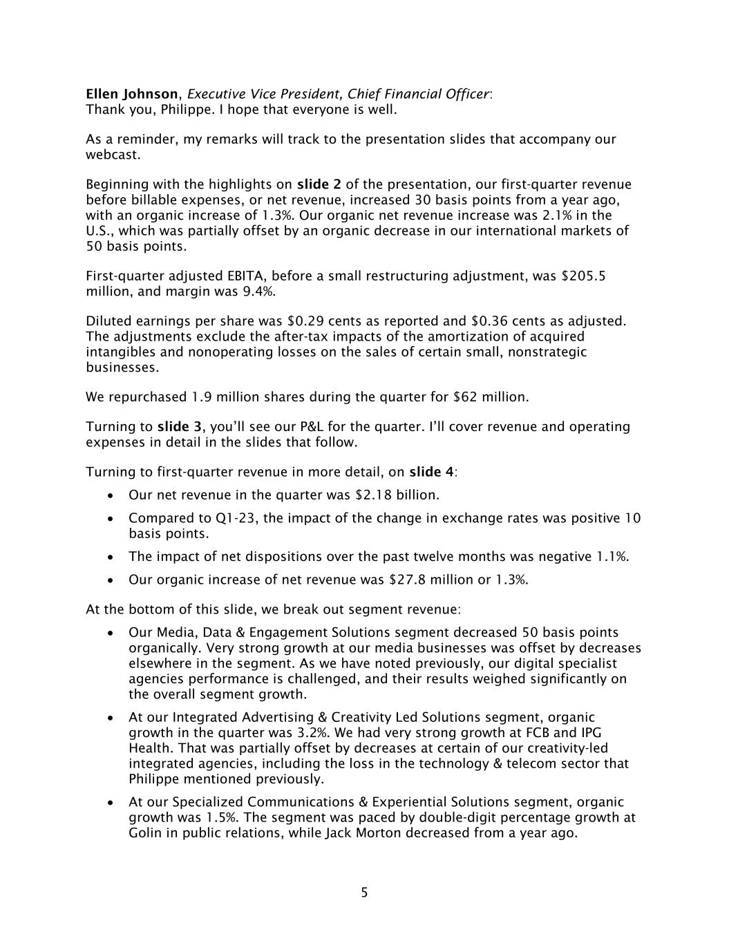 5 Ellen Johnson, Executive Vice President, Chief Financial Officer: Thank you, Philippe. I hope that everyone is well. As a reminder, my remarks will track to the presentation slides that accompany our webcast. Beginning with the highlights on slide 2 of the presentation, our first-quarter revenue before billable expenses, or net revenue, increased 30 basis points from a year ago, with an organic increase of 1.3%. Our organic net revenue increase was 2.1% in the U.S., which was partially offset by an organic decrease in our international markets of 50 basis points. First-quarter adjusted EBITA, before a small restructuring adjustment, was $205.5 million, and margin was 9.4%. Diluted earnings per share was $0.29 cents as reported and $0.36 cents as adjusted. The adjustments exclude the after-tax impacts of the amortization of acquired intangibles and nonoperating losses on the sales of certain small, nonstrategic businesses. We repurchased 1.9 million shares during the quarter for $62 million. Turning to slide 3, you’ll see our P&L for the quarter. I’ll cover revenue and operating expenses in detail in the slides that follow. Turning to first-quarter revenue in more detail, on slide 4:  Our net revenue in the quarter was $2.18 billion.  Compared to Q1-23, the impact of the change in exchange rates was positive 10 basis points.  The impact of net dispositions over the past twelve months was negative 1.1%.  Our organic increase of net revenue was $27.8 million or 1.3%. At the bottom of this slide, we break out segment revenue:  Our Media, Data & Engagement Solutions segment decreased 50 basis points organically. Very strong growth at our media businesses was offset by decreases elsewhere in the segment. As we have noted previously, our digital specialist agencies performance is challenged, and their results weighed significantly on the overall segment growth.  At our Integrated Advertising & Creativity Led Solutions segment, organic growth in the quarter was 3.2%. We had very strong growth at FCB and IPG Health. That was partially offset by decreases at certain of our creativity-led integrated agencies, including the loss in the technology & telecom sector that Philippe mentioned previously.  At our Specialized Communications & Experiential Solutions segment, organic growth was 1.5%. The segment was paced by double-digit percentage growth at Golin in public relations, while Jack Morton decreased from a year ago.