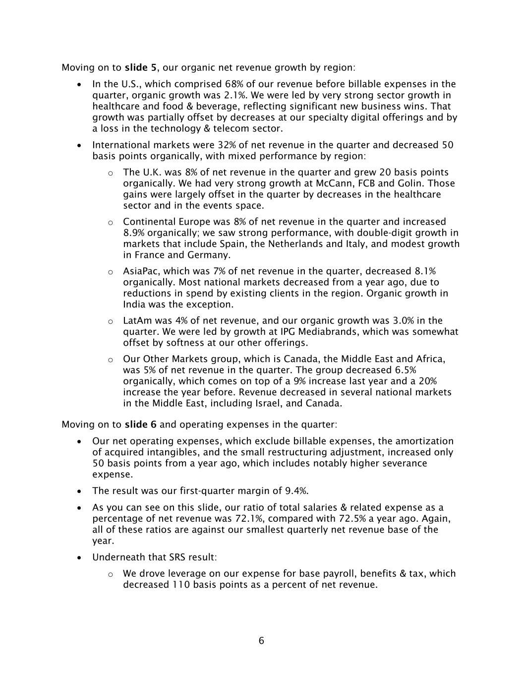 6 Moving on to slide 5, our organic net revenue growth by region:  In the U.S., which comprised 68% of our revenue before billable expenses in the quarter, organic growth was 2.1%. We were led by very strong sector growth in healthcare and food & beverage, reflecting significant new business wins. That growth was partially offset by decreases at our specialty digital offerings and by a loss in the technology & telecom sector.  International markets were 32% of net revenue in the quarter and decreased 50 basis points organically, with mixed performance by region: o The U.K. was 8% of net revenue in the quarter and grew 20 basis points organically. We had very strong growth at McCann, FCB and Golin. Those gains were largely offset in the quarter by decreases in the healthcare sector and in the events space. o Continental Europe was 8% of net revenue in the quarter and increased 8.9% organically; we saw strong performance, with double-digit growth in markets that include Spain, the Netherlands and Italy, and modest growth in France and Germany. o AsiaPac, which was 7% of net revenue in the quarter, decreased 8.1% organically. Most national markets decreased from a year ago, due to reductions in spend by existing clients in the region. Organic growth in India was the exception. o LatAm was 4% of net revenue, and our organic growth was 3.0% in the quarter. We were led by growth at IPG Mediabrands, which was somewhat offset by softness at our other offerings. o Our Other Markets group, which is Canada, the Middle East and Africa, was 5% of net revenue in the quarter. The group decreased 6.5% organically, which comes on top of a 9% increase last year and a 20% increase the year before. Revenue decreased in several national markets in the Middle East, including Israel, and Canada. Moving on to slide 6 and operating expenses in the quarter:  Our net operating expenses, which exclude billable expenses, the amortization of acquired intangibles, and the small restructuring adjustment, increased only 50 basis points from a year ago, which includes notably higher severance expense.  The result was our first-quarter margin of 9.4%.  As you can see on this slide, our ratio of total salaries & related expense as a percentage of net revenue was 72.1%, compared with 72.5% a year ago. Again, all of these ratios are against our smallest quarterly net revenue base of the year.  Underneath that SRS result: o We drove leverage on our expense for base payroll, benefits & tax, which decreased 110 basis points as a percent of net revenue.