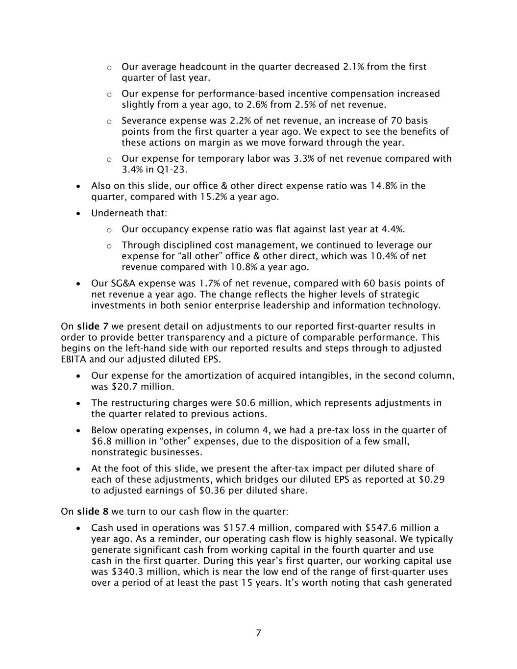 7 o Our average headcount in the quarter decreased 2.1% from the first quarter of last year. o Our expense for performance-based incentive compensation increased slightly from a year ago, to 2.6% from 2.5% of net revenue. o Severance expense was 2.2% of net revenue, an increase of 70 basis points from the first quarter a year ago. We expect to see the benefits of these actions on margin as we move forward through the year. o Our expense for temporary labor was 3.3% of net revenue compared with 3.4% in Q1-23.  Also on this slide, our office & other direct expense ratio was 14.8% in the quarter, compared with 15.2% a year ago.  Underneath that: o Our occupancy expense ratio was flat against last year at 4.4%. o Through disciplined cost management, we continued to leverage our expense for “all other” office & other direct, which was 10.4% of net revenue compared with 10.8% a year ago.  Our SG&A expense was 1.7% of net revenue, compared with 60 basis points of net revenue a year ago. The change reflects the higher levels of strategic investments in both senior enterprise leadership and information technology. On slide 7 we present detail on adjustments to our reported first-quarter results in order to provide better transparency and a picture of comparable performance. This begins on the left-hand side with our reported results and steps through to adjusted EBITA and our adjusted diluted EPS.  Our expense for the amortization of acquired intangibles, in the second column, was $20.7 million.  The restructuring charges were $0.6 million, which represents adjustments in the quarter related to previous actions.  Below operating expenses, in column 4, we had a pre-tax loss in the quarter of $6.8 million in “other” expenses, due to the disposition of a few small, nonstrategic businesses.  At the foot of this slide, we present the after-tax impact per diluted share of each of these adjustments, which bridges our diluted EPS as reported at $0.29 to adjusted earnings of $0.36 per diluted share. On slide 8 we turn to our cash flow in the quarter:  Cash used in operations was $157.4 million, compared with $547.6 million a year ago. As a reminder, our operating cash flow is highly seasonal. We typically generate significant cash from working capital in the fourth quarter and use cash in the first quarter. During this year’s first quarter, our working capital use was $340.3 million, which is near the low end of the range of first-quarter uses over a period of at least the past 15 years. It’s worth noting that cash generated