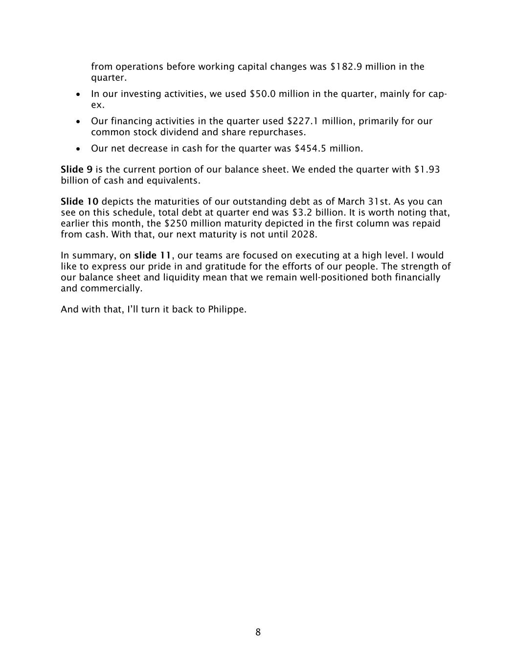 8 from operations before working capital changes was $182.9 million in the quarter.  In our investing activities, we used $50.0 million in the quarter, mainly for cap- ex.  Our financing activities in the quarter used $227.1 million, primarily for our common stock dividend and share repurchases.  Our net decrease in cash for the quarter was $454.5 million. Slide 9 is the current portion of our balance sheet. We ended the quarter with $1.93 billion of cash and equivalents. Slide 10 depicts the maturities of our outstanding debt as of March 31st. As you can see on this schedule, total debt at quarter end was $3.2 billion. It is worth noting that, earlier this month, the $250 million maturity depicted in the first column was repaid from cash. With that, our next maturity is not until 2028. In summary, on slide 11, our teams are focused on executing at a high level. I would like to express our pride in and gratitude for the efforts of our people. The strength of our balance sheet and liquidity mean that we remain well-positioned both financially and commercially. And with that, I’ll turn it back to Philippe.