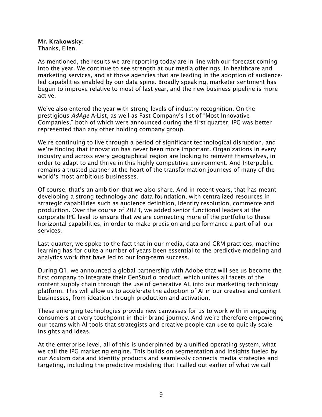 9 Mr. Krakowsky: Thanks, Ellen. As mentioned, the results we are reporting today are in line with our forecast coming into the year. We continue to see strength at our media offerings, in healthcare and marketing services, and at those agencies that are leading in the adoption of audience- led capabilities enabled by our data spine. Broadly speaking, marketer sentiment has begun to improve relative to most of last year, and the new business pipeline is more active. We’ve also entered the year with strong levels of industry recognition. On the prestigious AdAge A-List, as well as Fast Company’s list of “Most Innovative Companies,” both of which were announced during the first quarter, IPG was better represented than any other holding company group. We’re continuing to live through a period of significant technological disruption, and we’re finding that innovation has never been more important. Organizations in every industry and across every geographical region are looking to reinvent themselves, in order to adapt to and thrive in this highly competitive environment. And Interpublic remains a trusted partner at the heart of the transformation journeys of many of the world’s most ambitious businesses. Of course, that’s an ambition that we also share. And in recent years, that has meant developing a strong technology and data foundation, with centralized resources in strategic capabilities such as audience definition, identity resolution, commerce and production. Over the course of 2023, we added senior functional leaders at the corporate IPG level to ensure that we are connecting more of the portfolio to these horizontal capabilities, in order to make precision and performance a part of all our services. Last quarter, we spoke to the fact that in our media, data and CRM practices, machine learning has for quite a number of years been essential to the predictive modeling and analytics work that have led to our long-term success. During Q1, we announced a global partnership with Adobe that will see us become the first company to integrate their GenStudio product, which unites all facets of the content supply chain through the use of generative AI, into our marketing technology platform. This will allow us to accelerate the adoption of AI in our creative and content businesses, from ideation through production and activation. These emerging technologies provide new canvasses for us to work with in engaging consumers at every touchpoint in their brand journey. And we’re therefore empowering our teams with AI tools that strategists and creative people can use to quickly scale insights and ideas. At the enterprise level, all of this is underpinned by a unified operating system, what we call the IPG marketing engine. This builds on segmentation and insights fueled by our Acxiom data and identity products and seamlessly connects media strategies and targeting, including the predictive modeling that I called out earlier of what we call