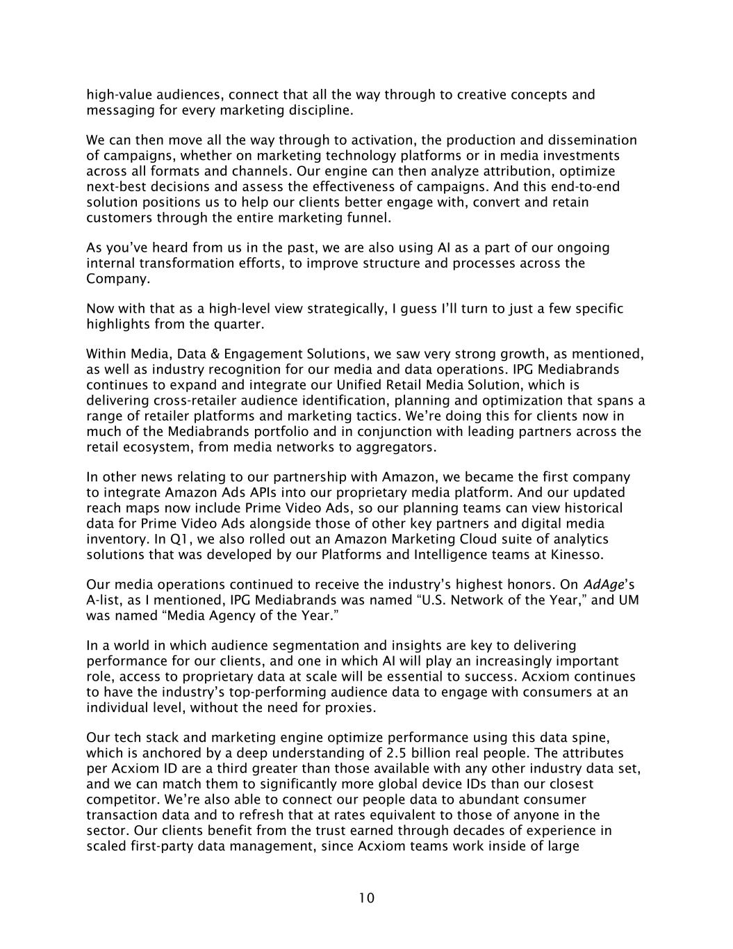 10 high-value audiences, connect that all the way through to creative concepts and messaging for every marketing discipline. We can then move all the way through to activation, the production and dissemination of campaigns, whether on marketing technology platforms or in media investments across all formats and channels. Our engine can then analyze attribution, optimize next-best decisions and assess the effectiveness of campaigns. And this end-to-end solution positions us to help our clients better engage with, convert and retain customers through the entire marketing funnel. As you’ve heard from us in the past, we are also using AI as a part of our ongoing internal transformation efforts, to improve structure and processes across the Company. Now with that as a high-level view strategically, I guess I’ll turn to just a few specific highlights from the quarter. Within Media, Data & Engagement Solutions, we saw very strong growth, as mentioned, as well as industry recognition for our media and data operations. IPG Mediabrands continues to expand and integrate our Unified Retail Media Solution, which is delivering cross-retailer audience identification, planning and optimization that spans a range of retailer platforms and marketing tactics. We’re doing this for clients now in much of the Mediabrands portfolio and in conjunction with leading partners across the retail ecosystem, from media networks to aggregators. In other news relating to our partnership with Amazon, we became the first company to integrate Amazon Ads APIs into our proprietary media platform. And our updated reach maps now include Prime Video Ads, so our planning teams can view historical data for Prime Video Ads alongside those of other key partners and digital media inventory. In Q1, we also rolled out an Amazon Marketing Cloud suite of analytics solutions that was developed by our Platforms and Intelligence teams at Kinesso. Our media operations continued to receive the industry’s highest honors. On AdAge’s A-list, as I mentioned, IPG Mediabrands was named “U.S. Network of the Year,” and UM was named “Media Agency of the Year.” In a world in which audience segmentation and insights are key to delivering performance for our clients, and one in which AI will play an increasingly important role, access to proprietary data at scale will be essential to success. Acxiom continues to have the industry’s top-performing audience data to engage with consumers at an individual level, without the need for proxies. Our tech stack and marketing engine optimize performance using this data spine, which is anchored by a deep understanding of 2.5 billion real people. The attributes per Acxiom ID are a third greater than those available with any other industry data set, and we can match them to significantly more global device IDs than our closest competitor. We’re also able to connect our people data to abundant consumer transaction data and to refresh that at rates equivalent to those of anyone in the sector. Our clients benefit from the trust earned through decades of experience in scaled first-party data management, since Acxiom teams work inside of large