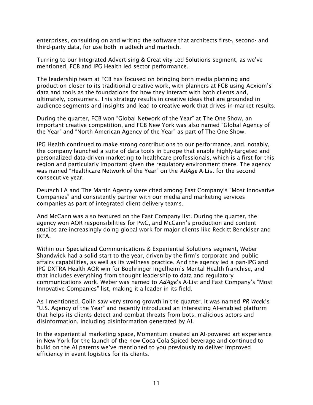 11 enterprises, consulting on and writing the software that architects first-, second- and third-party data, for use both in adtech and martech. Turning to our Integrated Advertising & Creativity Led Solutions segment, as we’ve mentioned, FCB and IPG Health led sector performance. The leadership team at FCB has focused on bringing both media planning and production closer to its traditional creative work, with planners at FCB using Acxiom’s data and tools as the foundations for how they interact with both clients and, ultimately, consumers. This strategy results in creative ideas that are grounded in audience segments and insights and lead to creative work that drives in-market results. During the quarter, FCB won “Global Network of the Year” at The One Show, an important creative competition, and FCB New York was also named “Global Agency of the Year” and “North American Agency of the Year” as part of The One Show. IPG Health continued to make strong contributions to our performance, and, notably, the company launched a suite of data tools in Europe that enable highly-targeted and personalized data-driven marketing to healthcare professionals, which is a first for this region and particularly important given the regulatory environment there. The agency was named “Healthcare Network of the Year” on the AdAge A-List for the second consecutive year. Deutsch LA and The Martin Agency were cited among Fast Company’s “Most Innovative Companies” and consistently partner with our media and marketing services companies as part of integrated client delivery teams. And McCann was also featured on the Fast Company list. During the quarter, the agency won AOR responsibilities for PwC, and McCann’s production and content studios are increasingly doing global work for major clients like Reckitt Benckiser and IKEA. Within our Specialized Communications & Experiential Solutions segment, Weber Shandwick had a solid start to the year, driven by the firm’s corporate and public affairs capabilities, as well as its wellness practice. And the agency led a pan-IPG and IPG DXTRA Health AOR win for Boehringer Ingelheim’s Mental Health franchise, and that includes everything from thought leadership to data and regulatory communications work. Weber was named to AdAge’s A-List and Fast Company’s “Most Innovative Companies” list, making it a leader in its field. As I mentioned, Golin saw very strong growth in the quarter. It was named PR Week’s “U.S. Agency of the Year” and recently introduced an interesting AI-enabled platform that helps its clients detect and combat threats from bots, malicious actors and disinformation, including disinformation generated by AI. In the experiential marketing space, Momentum created an AI-powered art experience in New York for the launch of the new Coca-Cola Spiced beverage and continued to build on the AI patents we’ve mentioned to you previously to deliver improved efficiency in event logistics for its clients.