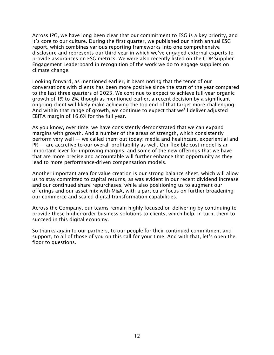 12 Across IPG, we have long been clear that our commitment to ESG is a key priority, and it’s core to our culture. During the first quarter, we published our ninth annual ESG report, which combines various reporting frameworks into one comprehensive disclosure and represents our third year in which we’ve engaged external experts to provide assurances on ESG metrics. We were also recently listed on the CDP Supplier Engagement Leaderboard in recognition of the work we do to engage suppliers on climate change. Looking forward, as mentioned earlier, it bears noting that the tenor of our conversations with clients has been more positive since the start of the year compared to the last three quarters of 2023. We continue to expect to achieve full-year organic growth of 1% to 2%, though as mentioned earlier, a recent decision by a significant ongoing client will likely make achieving the top end of that target more challenging. And within that range of growth, we continue to expect that we’ll deliver adjusted EBITA margin of 16.6% for the full year. As you know, over time, we have consistently demonstrated that we can expand margins with growth. And a number of the areas of strength, which consistently perform very well — we called them out today: media and healthcare, experiential and PR — are accretive to our overall profitability as well. Our flexible cost model is an important lever for improving margins, and some of the new offerings that we have that are more precise and accountable will further enhance that opportunity as they lead to more performance-driven compensation models. Another important area for value creation is our strong balance sheet, which will allow us to stay committed to capital returns, as was evident in our recent dividend increase and our continued share repurchases, while also positioning us to augment our offerings and our asset mix with M&A, with a particular focus on further broadening our commerce and scaled digital transformation capabilities. Across the Company, our teams remain highly focused on delivering by continuing to provide these higher-order business solutions to clients, which help, in turn, them to succeed in this digital economy. So thanks again to our partners, to our people for their continued commitment and support, to all of those of you on this call for your time. And with that, let’s open the floor to questions.