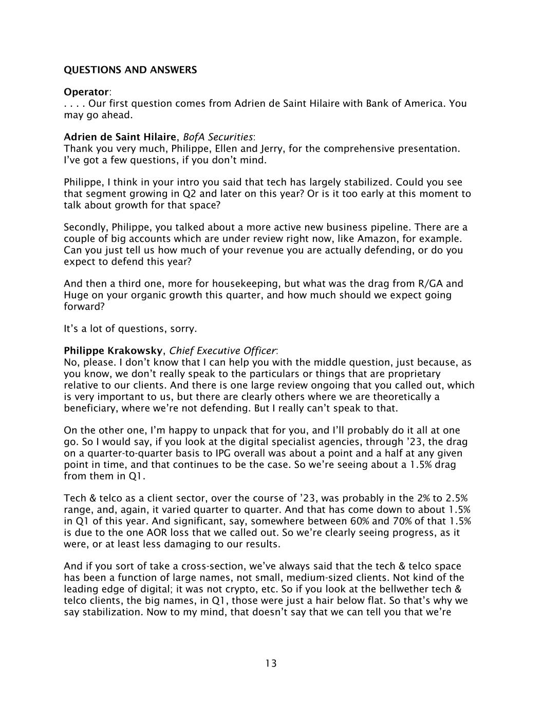 13 QUESTIONS AND ANSWERS Operator: . . . . Our first question comes from Adrien de Saint Hilaire with Bank of America. You may go ahead. Adrien de Saint Hilaire, BofA Securities: Thank you very much, Philippe, Ellen and Jerry, for the comprehensive presentation. I’ve got a few questions, if you don’t mind. Philippe, I think in your intro you said that tech has largely stabilized. Could you see that segment growing in Q2 and later on this year? Or is it too early at this moment to talk about growth for that space? Secondly, Philippe, you talked about a more active new business pipeline. There are a couple of big accounts which are under review right now, like Amazon, for example. Can you just tell us how much of your revenue you are actually defending, or do you expect to defend this year? And then a third one, more for housekeeping, but what was the drag from R/GA and Huge on your organic growth this quarter, and how much should we expect going forward? It’s a lot of questions, sorry. Philippe Krakowsky, Chief Executive Officer: No, please. I don’t know that I can help you with the middle question, just because, as you know, we don’t really speak to the particulars or things that are proprietary relative to our clients. And there is one large review ongoing that you called out, which is very important to us, but there are clearly others where we are theoretically a beneficiary, where we’re not defending. But I really can’t speak to that. On the other one, I’m happy to unpack that for you, and I’ll probably do it all at one go. So I would say, if you look at the digital specialist agencies, through ’23, the drag on a quarter-to-quarter basis to IPG overall was about a point and a half at any given point in time, and that continues to be the case. So we’re seeing about a 1.5% drag from them in Q1. Tech & telco as a client sector, over the course of ’23, was probably in the 2% to 2.5% range, and, again, it varied quarter to quarter. And that has come down to about 1.5% in Q1 of this year. And significant, say, somewhere between 60% and 70% of that 1.5% is due to the one AOR loss that we called out. So we’re clearly seeing progress, as it were, or at least less damaging to our results. And if you sort of take a cross-section, we’ve always said that the tech & telco space has been a function of large names, not small, medium-sized clients. Not kind of the leading edge of digital; it was not crypto, etc. So if you look at the bellwether tech & telco clients, the big names, in Q1, those were just a hair below flat. So that’s why we say stabilization. Now to my mind, that doesn’t say that we can tell you that we’re