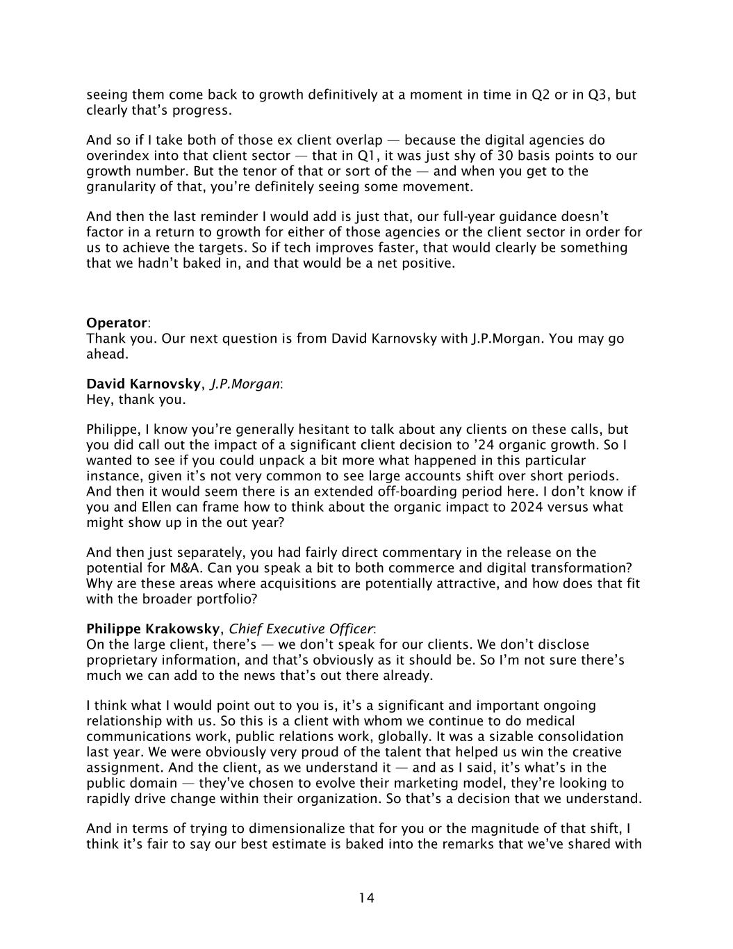 14 seeing them come back to growth definitively at a moment in time in Q2 or in Q3, but clearly that’s progress. And so if I take both of those ex client overlap — because the digital agencies do overindex into that client sector — that in Q1, it was just shy of 30 basis points to our growth number. But the tenor of that or sort of the — and when you get to the granularity of that, you’re definitely seeing some movement. And then the last reminder I would add is just that, our full-year guidance doesn’t factor in a return to growth for either of those agencies or the client sector in order for us to achieve the targets. So if tech improves faster, that would clearly be something that we hadn’t baked in, and that would be a net positive. Operator: Thank you. Our next question is from David Karnovsky with J.P.Morgan. You may go ahead. David Karnovsky, J.P.Morgan: Hey, thank you. Philippe, I know you’re generally hesitant to talk about any clients on these calls, but you did call out the impact of a significant client decision to ’24 organic growth. So I wanted to see if you could unpack a bit more what happened in this particular instance, given it’s not very common to see large accounts shift over short periods. And then it would seem there is an extended off-boarding period here. I don’t know if you and Ellen can frame how to think about the organic impact to 2024 versus what might show up in the out year? And then just separately, you had fairly direct commentary in the release on the potential for M&A. Can you speak a bit to both commerce and digital transformation? Why are these areas where acquisitions are potentially attractive, and how does that fit with the broader portfolio? Philippe Krakowsky, Chief Executive Officer: On the large client, there’s — we don’t speak for our clients. We don’t disclose proprietary information, and that’s obviously as it should be. So I’m not sure there’s much we can add to the news that’s out there already. I think what I would point out to you is, it’s a significant and important ongoing relationship with us. So this is a client with whom we continue to do medical communications work, public relations work, globally. It was a sizable consolidation last year. We were obviously very proud of the talent that helped us win the creative assignment. And the client, as we understand it — and as I said, it’s what’s in the public domain — they’ve chosen to evolve their marketing model, they’re looking to rapidly drive change within their organization. So that’s a decision that we understand. And in terms of trying to dimensionalize that for you or the magnitude of that shift, I think it’s fair to say our best estimate is baked into the remarks that we’ve shared with