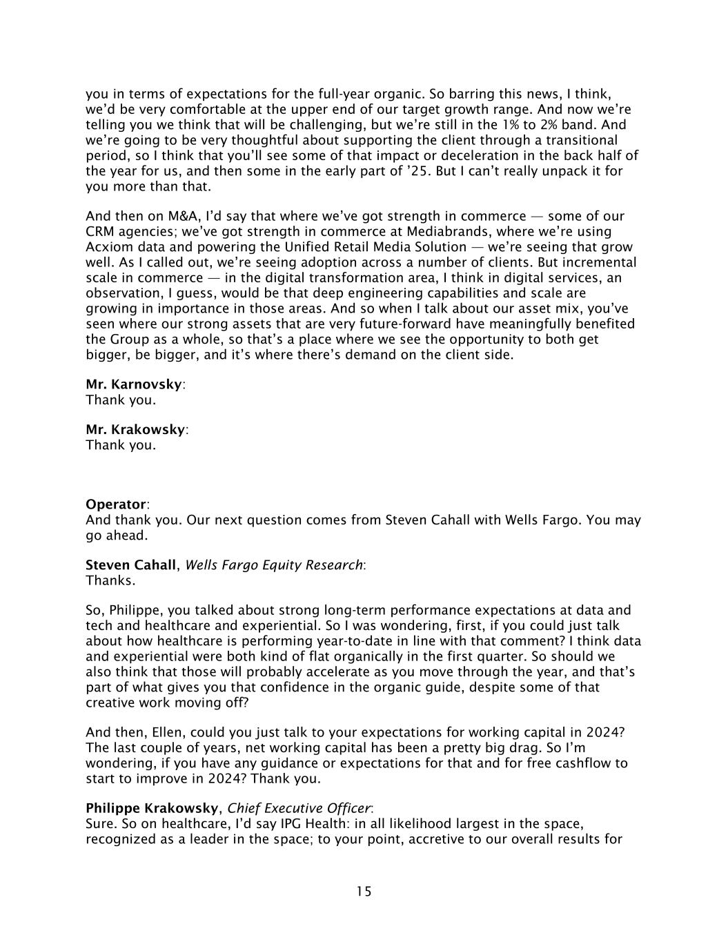 15 you in terms of expectations for the full-year organic. So barring this news, I think, we’d be very comfortable at the upper end of our target growth range. And now we’re telling you we think that will be challenging, but we’re still in the 1% to 2% band. And we’re going to be very thoughtful about supporting the client through a transitional period, so I think that you’ll see some of that impact or deceleration in the back half of the year for us, and then some in the early part of ’25. But I can’t really unpack it for you more than that. And then on M&A, I’d say that where we’ve got strength in commerce — some of our CRM agencies; we’ve got strength in commerce at Mediabrands, where we’re using Acxiom data and powering the Unified Retail Media Solution — we’re seeing that grow well. As I called out, we’re seeing adoption across a number of clients. But incremental scale in commerce — in the digital transformation area, I think in digital services, an observation, I guess, would be that deep engineering capabilities and scale are growing in importance in those areas. And so when I talk about our asset mix, you’ve seen where our strong assets that are very future-forward have meaningfully benefited the Group as a whole, so that’s a place where we see the opportunity to both get bigger, be bigger, and it’s where there’s demand on the client side. Mr. Karnovsky: Thank you. Mr. Krakowsky: Thank you. Operator: And thank you. Our next question comes from Steven Cahall with Wells Fargo. You may go ahead. Steven Cahall, Wells Fargo Equity Research: Thanks. So, Philippe, you talked about strong long-term performance expectations at data and tech and healthcare and experiential. So I was wondering, first, if you could just talk about how healthcare is performing year-to-date in line with that comment? I think data and experiential were both kind of flat organically in the first quarter. So should we also think that those will probably accelerate as you move through the year, and that’s part of what gives you that confidence in the organic guide, despite some of that creative work moving off? And then, Ellen, could you just talk to your expectations for working capital in 2024? The last couple of years, net working capital has been a pretty big drag. So I’m wondering, if you have any guidance or expectations for that and for free cashflow to start to improve in 2024? Thank you. Philippe Krakowsky, Chief Executive Officer: Sure. So on healthcare, I’d say IPG Health: in all likelihood largest in the space, recognized as a leader in the space; to your point, accretive to our overall results for