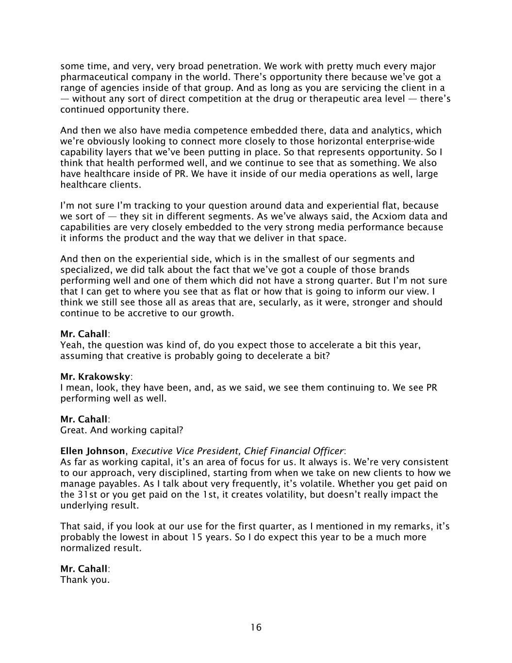 16 some time, and very, very broad penetration. We work with pretty much every major pharmaceutical company in the world. There’s opportunity there because we’ve got a range of agencies inside of that group. And as long as you are servicing the client in a — without any sort of direct competition at the drug or therapeutic area level — there’s continued opportunity there. And then we also have media competence embedded there, data and analytics, which we’re obviously looking to connect more closely to those horizontal enterprise-wide capability layers that we’ve been putting in place. So that represents opportunity. So I think that health performed well, and we continue to see that as something. We also have healthcare inside of PR. We have it inside of our media operations as well, large healthcare clients. I’m not sure I’m tracking to your question around data and experiential flat, because we sort of — they sit in different segments. As we’ve always said, the Acxiom data and capabilities are very closely embedded to the very strong media performance because it informs the product and the way that we deliver in that space. And then on the experiential side, which is in the smallest of our segments and specialized, we did talk about the fact that we’ve got a couple of those brands performing well and one of them which did not have a strong quarter. But I’m not sure that I can get to where you see that as flat or how that is going to inform our view. I think we still see those all as areas that are, secularly, as it were, stronger and should continue to be accretive to our growth. Mr. Cahall: Yeah, the question was kind of, do you expect those to accelerate a bit this year, assuming that creative is probably going to decelerate a bit? Mr. Krakowsky: I mean, look, they have been, and, as we said, we see them continuing to. We see PR performing well as well. Mr. Cahall: Great. And working capital? Ellen Johnson, Executive Vice President, Chief Financial Officer: As far as working capital, it’s an area of focus for us. It always is. We’re very consistent to our approach, very disciplined, starting from when we take on new clients to how we manage payables. As I talk about very frequently, it’s volatile. Whether you get paid on the 31st or you get paid on the 1st, it creates volatility, but doesn’t really impact the underlying result. That said, if you look at our use for the first quarter, as I mentioned in my remarks, it’s probably the lowest in about 15 years. So I do expect this year to be a much more normalized result. Mr. Cahall: Thank you.