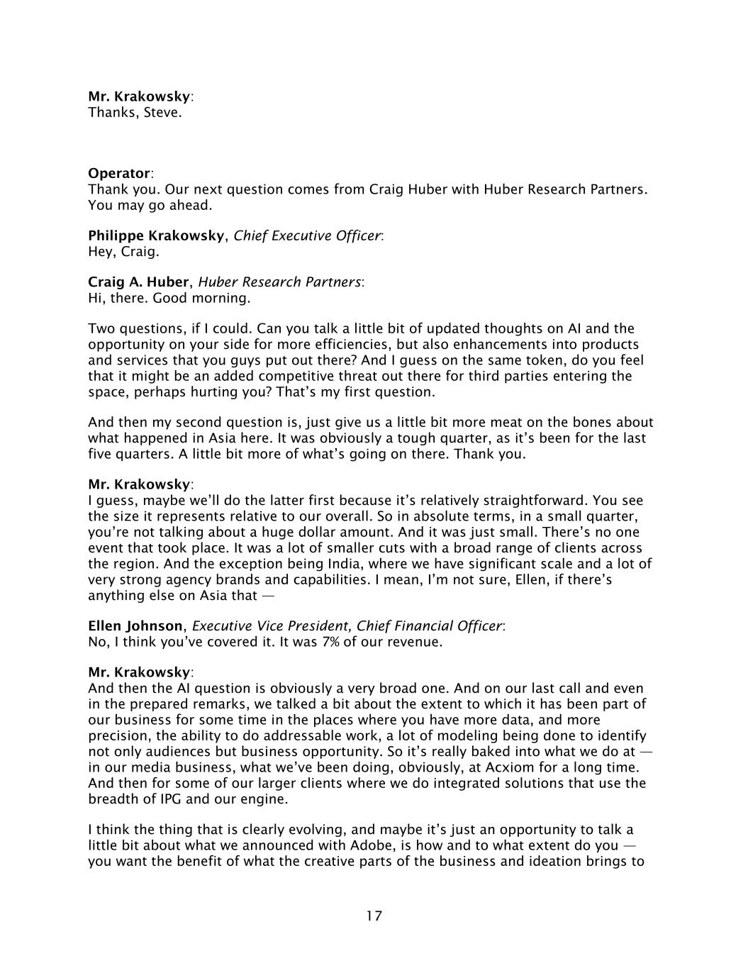 17 Mr. Krakowsky: Thanks, Steve. Operator: Thank you. Our next question comes from Craig Huber with Huber Research Partners. You may go ahead. Philippe Krakowsky, Chief Executive Officer: Hey, Craig. Craig A. Huber, Huber Research Partners: Hi, there. Good morning. Two questions, if I could. Can you talk a little bit of updated thoughts on AI and the opportunity on your side for more efficiencies, but also enhancements into products and services that you guys put out there? And I guess on the same token, do you feel that it might be an added competitive threat out there for third parties entering the space, perhaps hurting you? That’s my first question. And then my second question is, just give us a little bit more meat on the bones about what happened in Asia here. It was obviously a tough quarter, as it’s been for the last five quarters. A little bit more of what’s going on there. Thank you. Mr. Krakowsky: I guess, maybe we’ll do the latter first because it’s relatively straightforward. You see the size it represents relative to our overall. So in absolute terms, in a small quarter, you’re not talking about a huge dollar amount. And it was just small. There’s no one event that took place. It was a lot of smaller cuts with a broad range of clients across the region. And the exception being India, where we have significant scale and a lot of very strong agency brands and capabilities. I mean, I’m not sure, Ellen, if there’s anything else on Asia that — Ellen Johnson, Executive Vice President, Chief Financial Officer: No, I think you’ve covered it. It was 7% of our revenue. Mr. Krakowsky: And then the AI question is obviously a very broad one. And on our last call and even in the prepared remarks, we talked a bit about the extent to which it has been part of our business for some time in the places where you have more data, and more precision, the ability to do addressable work, a lot of modeling being done to identify not only audiences but business opportunity. So it’s really baked into what we do at — in our media business, what we’ve been doing, obviously, at Acxiom for a long time. And then for some of our larger clients where we do integrated solutions that use the breadth of IPG and our engine. I think the thing that is clearly evolving, and maybe it’s just an opportunity to talk a little bit about what we announced with Adobe, is how and to what extent do you — you want the benefit of what the creative parts of the business and ideation brings to