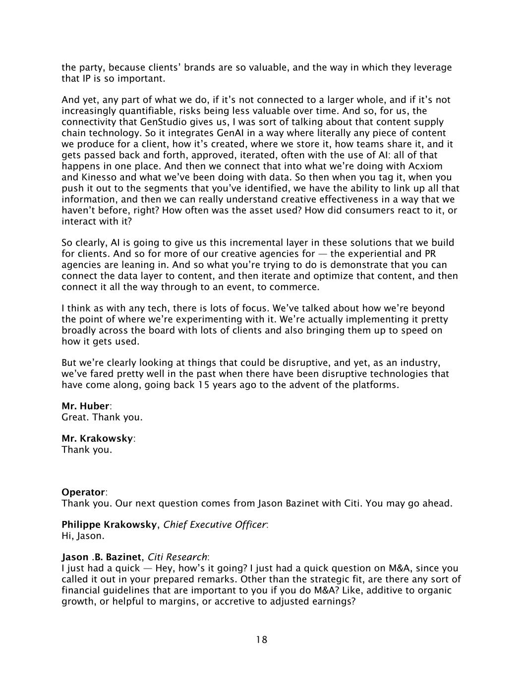 18 the party, because clients’ brands are so valuable, and the way in which they leverage that IP is so important. And yet, any part of what we do, if it’s not connected to a larger whole, and if it’s not increasingly quantifiable, risks being less valuable over time. And so, for us, the connectivity that GenStudio gives us, I was sort of talking about that content supply chain technology. So it integrates GenAI in a way where literally any piece of content we produce for a client, how it’s created, where we store it, how teams share it, and it gets passed back and forth, approved, iterated, often with the use of AI: all of that happens in one place. And then we connect that into what we’re doing with Acxiom and Kinesso and what we’ve been doing with data. So then when you tag it, when you push it out to the segments that you’ve identified, we have the ability to link up all that information, and then we can really understand creative effectiveness in a way that we haven’t before, right? How often was the asset used? How did consumers react to it, or interact with it? So clearly, AI is going to give us this incremental layer in these solutions that we build for clients. And so for more of our creative agencies for — the experiential and PR agencies are leaning in. And so what you’re trying to do is demonstrate that you can connect the data layer to content, and then iterate and optimize that content, and then connect it all the way through to an event, to commerce. I think as with any tech, there is lots of focus. We’ve talked about how we’re beyond the point of where we’re experimenting with it. We’re actually implementing it pretty broadly across the board with lots of clients and also bringing them up to speed on how it gets used. But we’re clearly looking at things that could be disruptive, and yet, as an industry, we’ve fared pretty well in the past when there have been disruptive technologies that have come along, going back 15 years ago to the advent of the platforms. Mr. Huber: Great. Thank you. Mr. Krakowsky: Thank you. Operator: Thank you. Our next question comes from Jason Bazinet with Citi. You may go ahead. Philippe Krakowsky, Chief Executive Officer: Hi, Jason. Jason .B. Bazinet, Citi Research: I just had a quick — Hey, how’s it going? I just had a quick question on M&A, since you called it out in your prepared remarks. Other than the strategic fit, are there any sort of financial guidelines that are important to you if you do M&A? Like, additive to organic growth, or helpful to margins, or accretive to adjusted earnings?