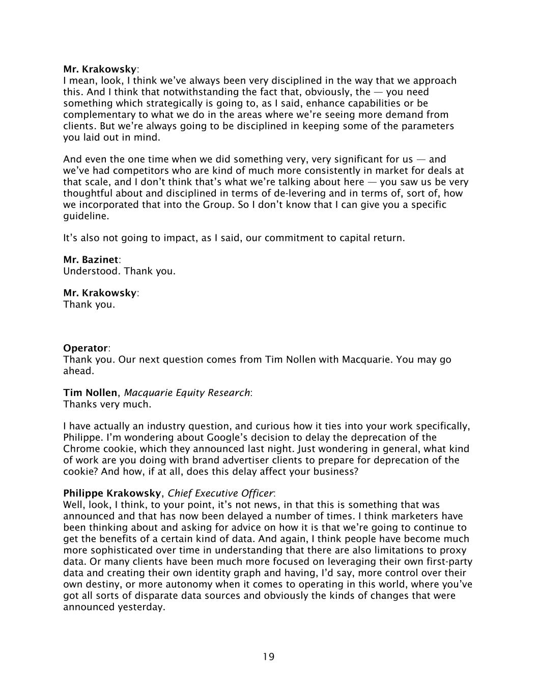 19 Mr. Krakowsky: I mean, look, I think we’ve always been very disciplined in the way that we approach this. And I think that notwithstanding the fact that, obviously, the — you need something which strategically is going to, as I said, enhance capabilities or be complementary to what we do in the areas where we’re seeing more demand from clients. But we’re always going to be disciplined in keeping some of the parameters you laid out in mind. And even the one time when we did something very, very significant for us — and we’ve had competitors who are kind of much more consistently in market for deals at that scale, and I don’t think that’s what we’re talking about here — you saw us be very thoughtful about and disciplined in terms of de-levering and in terms of, sort of, how we incorporated that into the Group. So I don’t know that I can give you a specific guideline. It’s also not going to impact, as I said, our commitment to capital return. Mr. Bazinet: Understood. Thank you. Mr. Krakowsky: Thank you. Operator: Thank you. Our next question comes from Tim Nollen with Macquarie. You may go ahead. Tim Nollen, Macquarie Equity Research: Thanks very much. I have actually an industry question, and curious how it ties into your work specifically, Philippe. I’m wondering about Google’s decision to delay the deprecation of the Chrome cookie, which they announced last night. Just wondering in general, what kind of work are you doing with brand advertiser clients to prepare for deprecation of the cookie? And how, if at all, does this delay affect your business? Philippe Krakowsky, Chief Executive Officer: Well, look, I think, to your point, it’s not news, in that this is something that was announced and that has now been delayed a number of times. I think marketers have been thinking about and asking for advice on how it is that we’re going to continue to get the benefits of a certain kind of data. And again, I think people have become much more sophisticated over time in understanding that there are also limitations to proxy data. Or many clients have been much more focused on leveraging their own first-party data and creating their own identity graph and having, I’d say, more control over their own destiny, or more autonomy when it comes to operating in this world, where you’ve got all sorts of disparate data sources and obviously the kinds of changes that were announced yesterday.