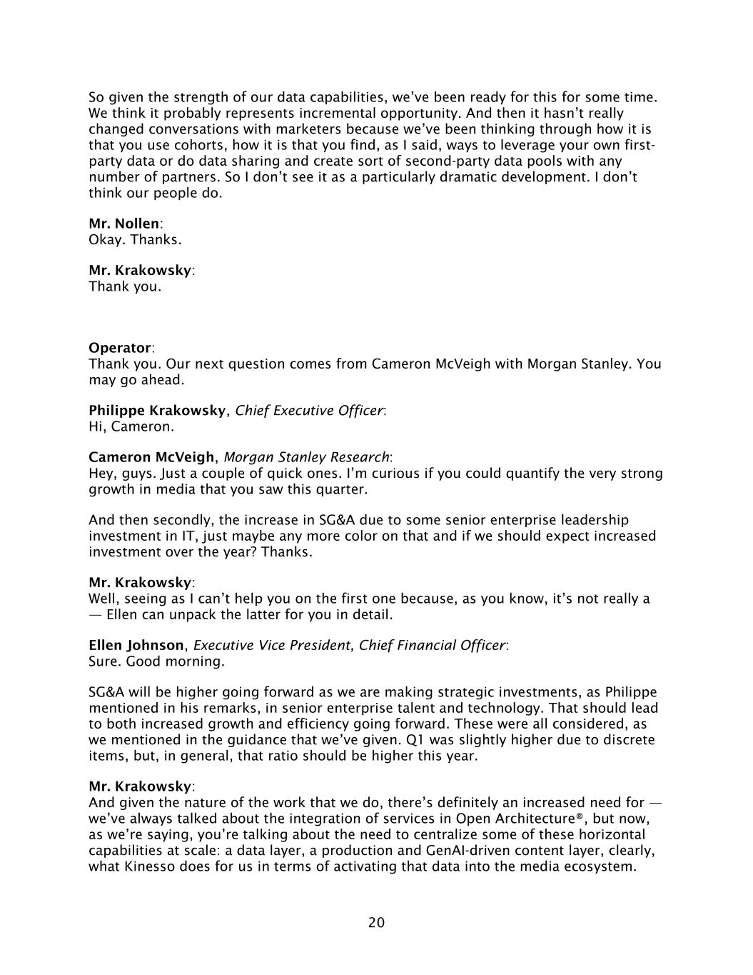 20 So given the strength of our data capabilities, we’ve been ready for this for some time. We think it probably represents incremental opportunity. And then it hasn’t really changed conversations with marketers because we’ve been thinking through how it is that you use cohorts, how it is that you find, as I said, ways to leverage your own first- party data or do data sharing and create sort of second-party data pools with any number of partners. So I don’t see it as a particularly dramatic development. I don’t think our people do. Mr. Nollen: Okay. Thanks. Mr. Krakowsky: Thank you. Operator: Thank you. Our next question comes from Cameron McVeigh with Morgan Stanley. You may go ahead. Philippe Krakowsky, Chief Executive Officer: Hi, Cameron. Cameron McVeigh, Morgan Stanley Research: Hey, guys. Just a couple of quick ones. I’m curious if you could quantify the very strong growth in media that you saw this quarter. And then secondly, the increase in SG&A due to some senior enterprise leadership investment in IT, just maybe any more color on that and if we should expect increased investment over the year? Thanks. Mr. Krakowsky: Well, seeing as I can’t help you on the first one because, as you know, it’s not really a — Ellen can unpack the latter for you in detail. Ellen Johnson, Executive Vice President, Chief Financial Officer: Sure. Good morning. SG&A will be higher going forward as we are making strategic investments, as Philippe mentioned in his remarks, in senior enterprise talent and technology. That should lead to both increased growth and efficiency going forward. These were all considered, as we mentioned in the guidance that we’ve given. Q1 was slightly higher due to discrete items, but, in general, that ratio should be higher this year. Mr. Krakowsky: And given the nature of the work that we do, there’s definitely an increased need for — we’ve always talked about the integration of services in Open Architecture®, but now, as we’re saying, you’re talking about the need to centralize some of these horizontal capabilities at scale: a data layer, a production and GenAI-driven content layer, clearly, what Kinesso does for us in terms of activating that data into the media ecosystem.