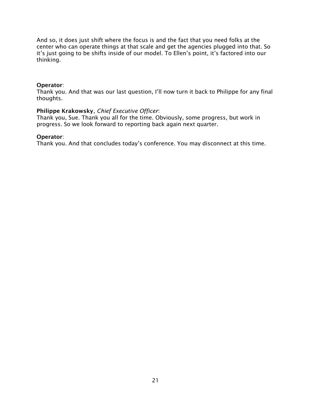 21 And so, it does just shift where the focus is and the fact that you need folks at the center who can operate things at that scale and get the agencies plugged into that. So it’s just going to be shifts inside of our model. To Ellen’s point, it’s factored into our thinking. Operator: Thank you. And that was our last question, I’ll now turn it back to Philippe for any final thoughts. Philippe Krakowsky, Chief Executive Officer: Thank you, Sue. Thank you all for the time. Obviously, some progress, but work in progress. So we look forward to reporting back again next quarter. Operator: Thank you. And that concludes today’s conference. You may disconnect at this time.