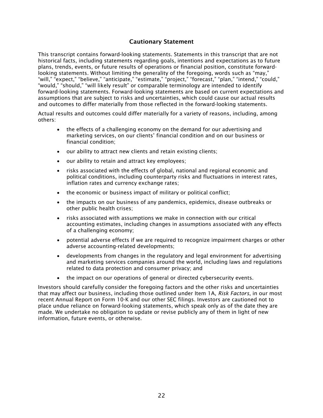 22 Cautionary Statement This transcript contains forward-looking statements. Statements in this transcript that are not historical facts, including statements regarding goals, intentions and expectations as to future plans, trends, events, or future results of operations or financial position, constitute forward- looking statements. Without limiting the generality of the foregoing, words such as “may,” “will,” “expect,” “believe,” “anticipate,” “estimate,” “project,” “forecast,” “plan,” “intend,” “could,” “would,” “should,” “will likely result” or comparable terminology are intended to identify forward-looking statements. Forward-looking statements are based on current expectations and assumptions that are subject to risks and uncertainties, which could cause our actual results and outcomes to differ materially from those reflected in the forward-looking statements. Actual results and outcomes could differ materially for a variety of reasons, including, among others:  the effects of a challenging economy on the demand for our advertising and marketing services, on our clients’ financial condition and on our business or financial condition;  our ability to attract new clients and retain existing clients;  our ability to retain and attract key employees;  risks associated with the effects of global, national and regional economic and political conditions, including counterparty risks and fluctuations in interest rates, inflation rates and currency exchange rates;  the economic or business impact of military or political conflict;  the impacts on our business of any pandemics, epidemics, disease outbreaks or other public health crises;  risks associated with assumptions we make in connection with our critical accounting estimates, including changes in assumptions associated with any effects of a challenging economy;  potential adverse effects if we are required to recognize impairment charges or other adverse accounting-related developments;  developments from changes in the regulatory and legal environment for advertising and marketing services companies around the world, including laws and regulations related to data protection and consumer privacy; and  the impact on our operations of general or directed cybersecurity events. Investors should carefully consider the foregoing factors and the other risks and uncertainties that may affect our business, including those outlined under Item 1A, Risk Factors, in our most recent Annual Report on Form 10-K and our other SEC filings. Investors are cautioned not to place undue reliance on forward-looking statements, which speak only as of the date they are made. We undertake no obligation to update or revise publicly any of them in light of new information, future events, or otherwise.