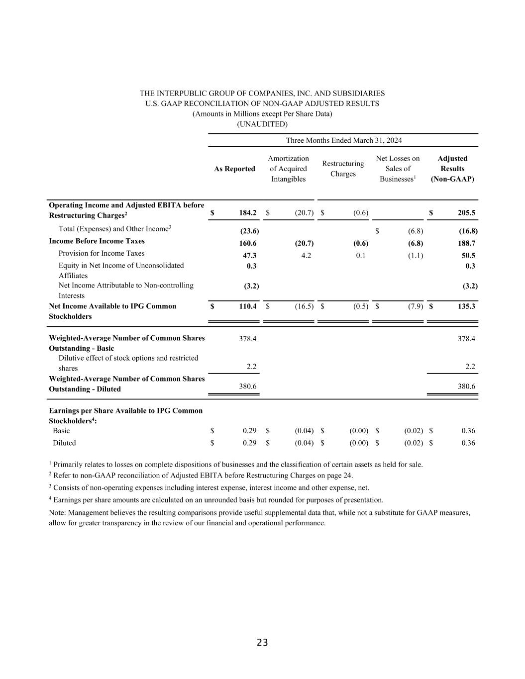 23 THE INTERPUBLIC GROUP OF COMPANIES, INC. AND SUBSIDIARIES U.S. GAAP RECONCILIATION OF NON-GAAP ADJUSTED RESULTS (Amounts in Millions except Per Share Data) (UNAUDITED) Three Months Ended March 31, 2024 As Reported Amortization of Acquired Intangibles Restructuring Charges Net Losses on Sales of Businesses1 Adjusted Results (Non-GAAP) Operating Income and Adjusted EBITA before Restructuring Charges2 $ 184.2 $ (20.7) $ (0.6) $ 205.5 Total (Expenses) and Other Income3 (23.6) $ (6.8) (16.8) Income Before Income Taxes 160.6 (20.7) (0.6) (6.8) 188.7 Provision for Income Taxes 47.3 4.2 0.1 (1.1) 50.5 Equity in Net Income of Unconsolidated Affiliates 0.3 0.3 Net Income Attributable to Non-controlling Interests (3.2) (3.2) Net Income Available to IPG Common Stockholders $ 110.4 $ (16.5) $ (0.5) $ (7.9) $ 135.3 Weighted-Average Number of Common Shares Outstanding - Basic 378.4 378.4 Dilutive effect of stock options and restricted shares 2.2 2.2 Weighted-Average Number of Common Shares Outstanding - Diluted 380.6 380.6 Earnings per Share Available to IPG Common Stockholders4: Basic $ 0.29 $ (0.04) $ (0.00) $ (0.02) $ 0.36 Diluted $ 0.29 $ (0.04) $ (0.00) $ (0.02) $ 0.36 1 Primarily relates to losses on complete dispositions of businesses and the classification of certain assets as held for sale. 2 Refer to non-GAAP reconciliation of Adjusted EBITA before Restructuring Charges on page 24. 3 Consists of non-operating expenses including interest expense, interest income and other expense, net. 4 Earnings per share amounts are calculated on an unrounded basis but rounded for purposes of presentation. Note: Management believes the resulting comparisons provide useful supplemental data that, while not a substitute for GAAP measures, allow for greater transparency in the review of our financial and operational performance.