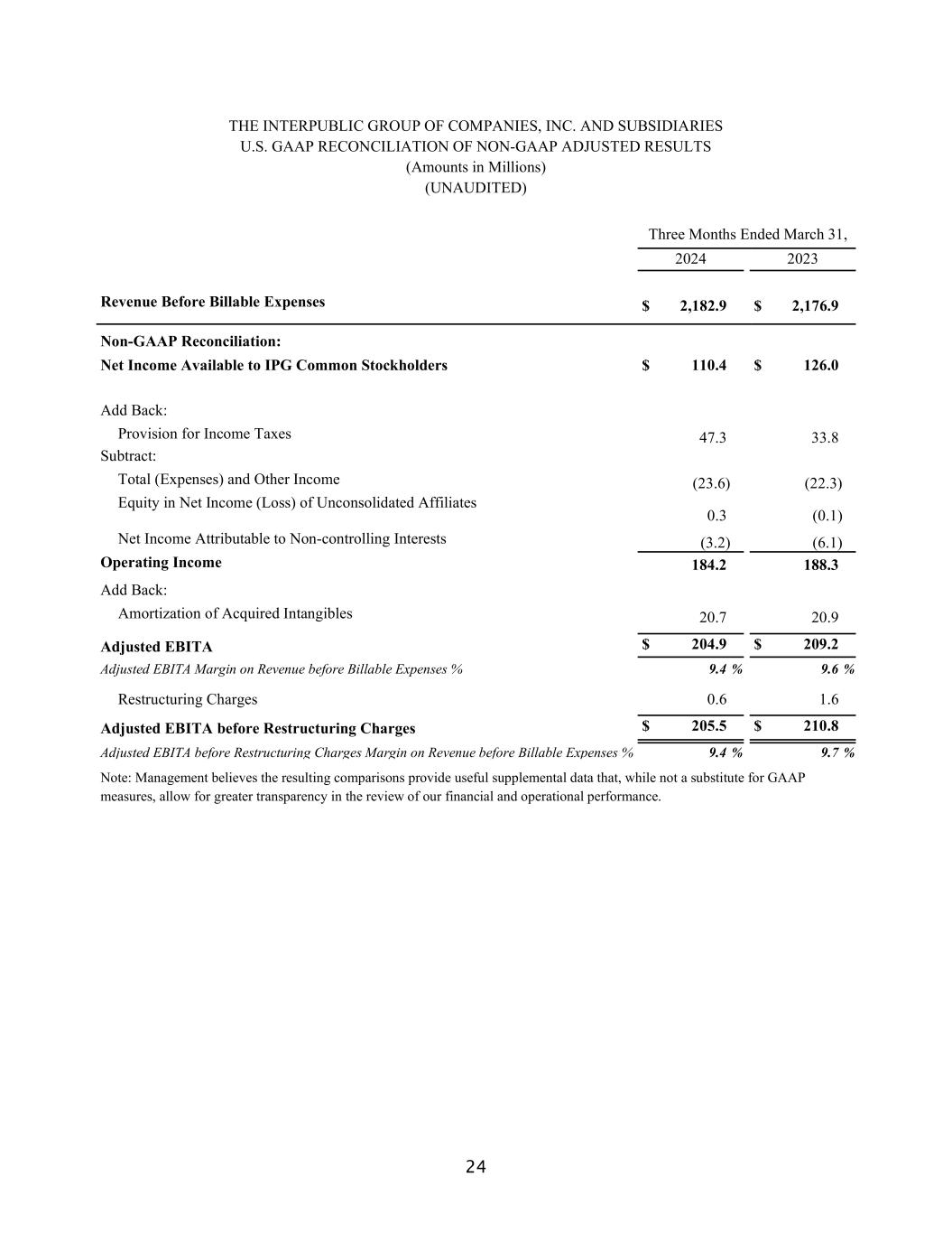 24 THE INTERPUBLIC GROUP OF COMPANIES, INC. AND SUBSIDIARIES U.S. GAAP RECONCILIATION OF NON-GAAP ADJUSTED RESULTS (Amounts in Millions) (UNAUDITED) Three Months Ended March 31, 2024 2023 Revenue Before Billable Expenses $ 2,182.9 $ 2,176.9 Non-GAAP Reconciliation: Net Income Available to IPG Common Stockholders $ 110.4 $ 126.0 Add Back: Provision for Income Taxes 47.3 33.8 Subtract: Total (Expenses) and Other Income (23.6) (22.3) Equity in Net Income (Loss) of Unconsolidated Affiliates 0.3 (0.1) Net Income Attributable to Non-controlling Interests (3.2) (6.1) Operating Income 184.2 188.3 Add Back: Amortization of Acquired Intangibles 20.7 20.9 Adjusted EBITA $ 204.9 $ 209.2 Adjusted EBITA Margin on Revenue before Billable Expenses % 9.4 % 9.6 % Restructuring Charges 0.6 1.6 Adjusted EBITA before Restructuring Charges $ 205.5 $ 210.8 Adjusted EBITA before Restructuring Charges Margin on Revenue before Billable Expenses % 9.4 % 9.7 % Note: Management believes the resulting comparisons provide useful supplemental data that, while not a substitute for GAAP measures, allow for greater transparency in the review of our financial and operational performance.
