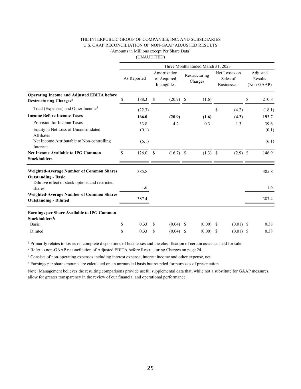 25 THE INTERPUBLIC GROUP OF COMPANIES, INC. AND SUBSIDIARIES U.S. GAAP RECONCILIATION OF NON-GAAP ADJUSTED RESULTS (Amounts in Millions except Per Share Data) (UNAUDITED) Three Months Ended March 31, 2023 As Reported Amortization of Acquired Intangibles Restructuring Charges Net Losses on Sales of Businesses1 Adjusted Results (Non-GAAP) Operating Income and Adjusted EBITA before Restructuring Charges2 $ 188.3 $ (20.9) $ (1.6) $ 210.8 Total (Expenses) and Other Income3 (22.3) $ (4.2) (18.1) Income Before Income Taxes 166.0 (20.9) (1.6) (4.2) 192.7 Provision for Income Taxes 33.8 4.2 0.3 1.3 39.6 Equity in Net Loss of Unconsolidated Affiliates (0.1) (0.1) Net Income Attributable to Non-controlling Interests (6.1) (6.1) Net Income Available to IPG Common Stockholders $ 126.0 $ (16.7) $ (1.3) $ (2.9) $ 146.9 Weighted-Average Number of Common Shares Outstanding - Basic 385.8 385.8 Dilutive effect of stock options and restricted shares 1.6 1.6 Weighted-Average Number of Common Shares Outstanding - Diluted 387.4 387.4 Earnings per Share Available to IPG Common Stockholders4: Basic $ 0.33 $ (0.04) $ (0.00) $ (0.01) $ 0.38 Diluted $ 0.33 $ (0.04) $ (0.00) $ (0.01) $ 0.38 1 Primarily relates to losses on complete dispositions of businesses and the classification of certain assets as held for sale. 2 Refer to non-GAAP reconciliation of Adjusted EBITA before Restructuring Charges on page 24. 3 Consists of non-operating expenses including interest expense, interest income and other expense, net. 4 Earnings per share amounts are calculated on an unrounded basis but rounded for purposes of presentation. Note: Management believes the resulting comparisons provide useful supplemental data that, while not a substitute for GAAP measures, allow for greater transparency in the review of our financial and operational performance.