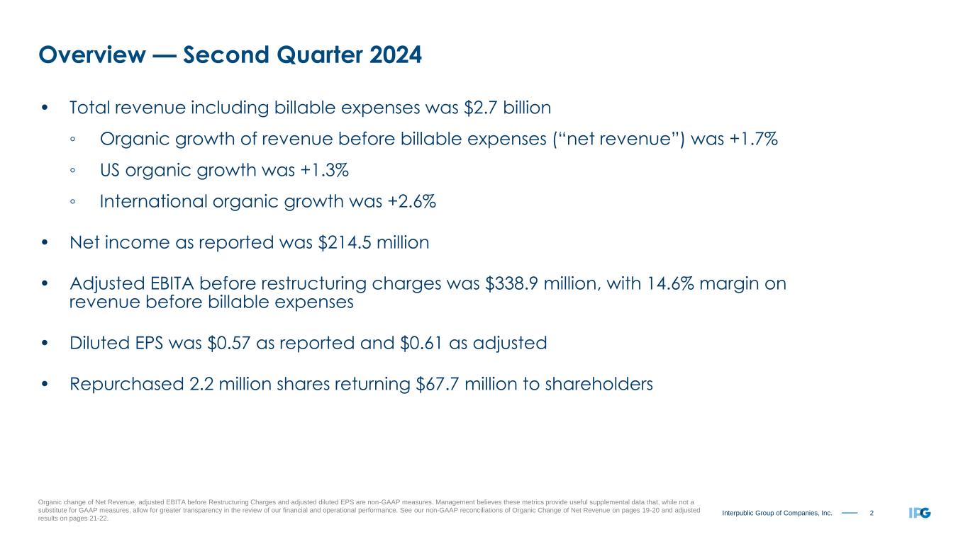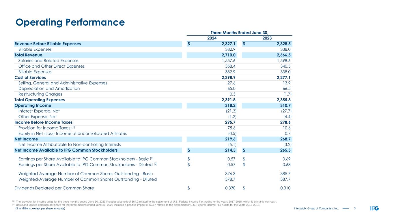 2Interpublic Group of Companies, Inc. Organic change of Net Revenue, adjusted EBITA before Restructuring Charges and adjusted diluted EPS are non-GAAP measures. Management believes these metrics provide useful supplemental data that, while not a substitute for GAAP measures, allow for greater transparency in the review of our financial and operational performance. See our non-GAAP reconciliations of Organic Change of Net Revenue on pages 19-20 and adjusted results on pages 21-22. • Total revenue including billable expenses was $2.7 billion ◦ Organic growth of revenue before billable expenses (“net revenue”) was +1.7% ◦ US organic growth was +1.3% ◦ International organic growth was +2.6% • Net income as reported was $214.5 million • Adjusted EBITA before restructuring charges was $338.9 million, with 14.6% margin on revenue before billable expenses • Diluted EPS was $0.57 as reported and $0.61 as adjusted • Repurchased 2.2 million shares returning $67.7 million to shareholders Overview — Second Quarter 2024