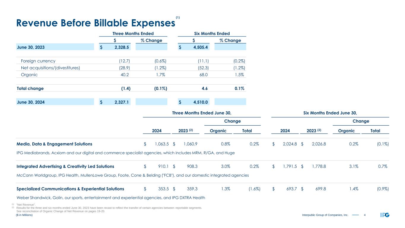 3Interpublic Group of Companies, Inc. Three Months Ended June 30, 2024 2023 Revenue Before Billable Expenses $ 2,327.1 $ 2,328.5 Billable Expenses 382.9 338.0 Total Revenue 2,710.0 2,666.5 Salaries and Related Expenses 1,557.6 1,598.6 Office and Other Direct Expenses 358.4 340.5 Billable Expenses 382.9 338.0 Cost of Services 2,298.9 2,277.1 Selling, General and Administrative Expenses 27.6 13.9 Depreciation and Amortization 65.0 66.5 Restructuring Charges 0.3 (1.7) Total Operating Expenses 2,391.8 2,355.8 Operating Income 318.2 310.7 Interest Expense, Net (21.3) (27.7) Other Expense, Net (1.2) (4.4) Income Before Income Taxes 295.7 278.6 Provision for Income Taxes (1) 75.6 10.6 Equity in Net (Loss) Income of Unconsolidated Affiliates (0.5) 0.7 Net Income 219.6 268.7 Net Income Attributable to Non-controlling Interests (5.1) (3.2) Net Income Available to IPG Common Stockholders $ 214.5 $ 265.5 Earnings per Share Available to IPG Common Stockholders - Basic (2) $ 0.57 $ 0.69 Earnings per Share Available to IPG Common Stockholders - Diluted (2) $ 0.57 $ 0.68 Weighted-Average Number of Common Shares Outstanding - Basic 376.3 385.7 Weighted-Average Number of Common Shares Outstanding - Diluted 378.7 387.7 Dividends Declared per Common Share $ 0.330 $ 0.310 ($ in Millions, except per share amounts) Operating Performance (1) The provision for income taxes for the three months ended June 30, 2023 includes a benefit of $64.2 related to the settlement of U.S. Federal Income Tax Audits for the years 2017-2018, which is primarily non-cash. (2) Basic and Diluted earnings per share for the three months ended June 30, 2023 includes a positive impact of $0.17 related to the settlement of U.S. Federal Income Tax Audits for the years 2017-2018.