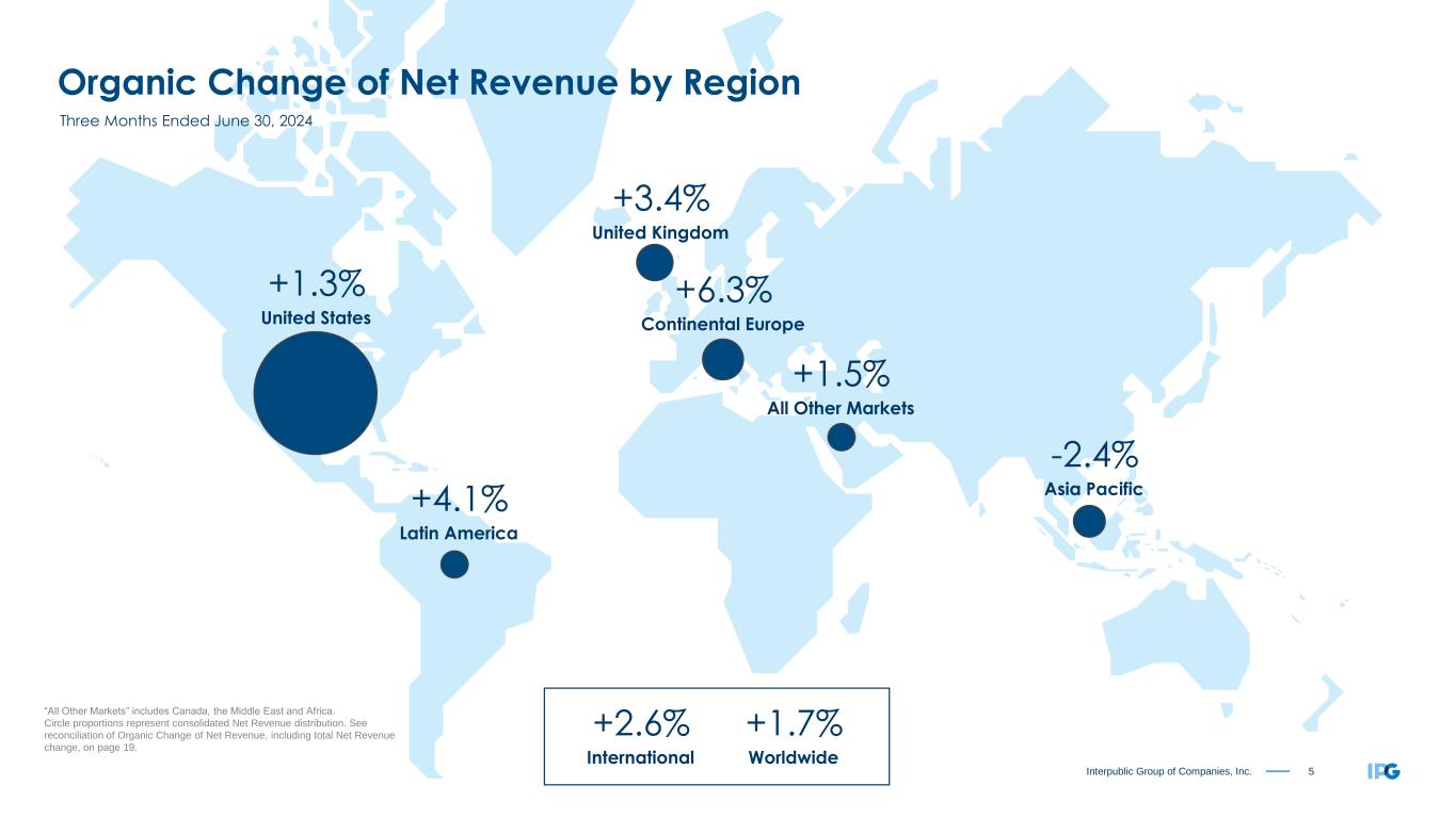 4Interpublic Group of Companies, Inc. Revenue Before Billable Expenses Three Months Ended June 30, Six Months Ended June 30, Change Change 2024 2023 (2) Organic Total 2024 2023 (2) Organic Total Media, Data & Engagement Solutions $ 1,063.5 $ 1,060.9 0.8% 0.2% $ 2,024.8 $ 2,026.8 0.2% (0.1%) IPG Mediabrands, Acxiom and our digital and commerce specialist agencies, which includes MRM, R/GA, and Huge Integrated Advertising & Creativity Led Solutions $ 910.1 $ 908.3 3.0% 0.2% $ 1,791.5 $ 1,778.8 3.1% 0.7% McCann Worldgroup, IPG Health, MullenLowe Group, Foote, Cone & Belding ("FCB"), and our domestic integrated agencies Specialized Communications & Experiential Solutions $ 353.5 $ 359.3 1.3% (1.6%) $ 693.7 $ 699.8 1.4% (0.9%) Weber Shandwick, Golin, our sports, entertainment and experiential agencies, and IPG DXTRA Health (1) "Net Revenue". (2) Results for the three and six months ended June 30, 2023 have been recast to reflect the transfer of certain agencies between reportable segments. See reconciliation of Organic Change of Net Revenue on pages 19-20. ($ in Millions) Three Months Ended Six Months Ended $ % Change $ % Change June 30, 2023 $ 2,328.5 $ 4,505.4 Foreign currency (12.7) (0.6%) (11.1) (0.2%) Net acquisitions/(divestitures) (28.9) (1.2%) (52.3) (1.2%) Organic 40.2 1.7% 68.0 1.5% Total change (1.4) (0.1%) 4.6 0.1% June 30, 2024 $ 2,327.1 $ 4,510.0 (1)