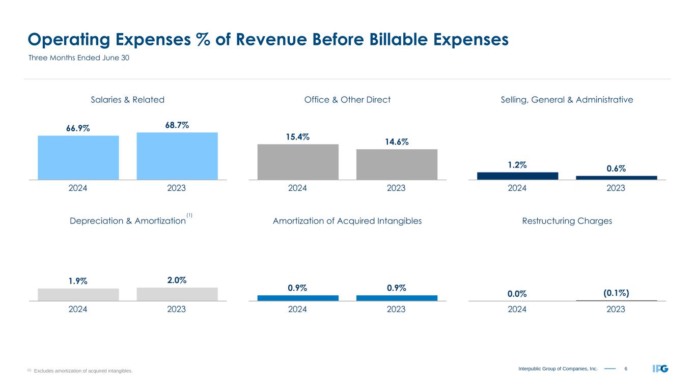 5Interpublic Group of Companies, Inc. Organic Change of Net Revenue by Region Three Months Ended June 30, 2024 +1.3% United States +3.4% United Kingdom +6.3% Continental Europe +4.1% Latin America -2.4% Asia Pacific +2.6% International +1.7% Worldwide +1.5% All Other Markets “All Other Markets” includes Canada, the Middle East and Africa. Circle proportions represent consolidated Net Revenue distribution. See reconciliation of Organic Change of Net Revenue, including total Net Revenue change, on page 19.