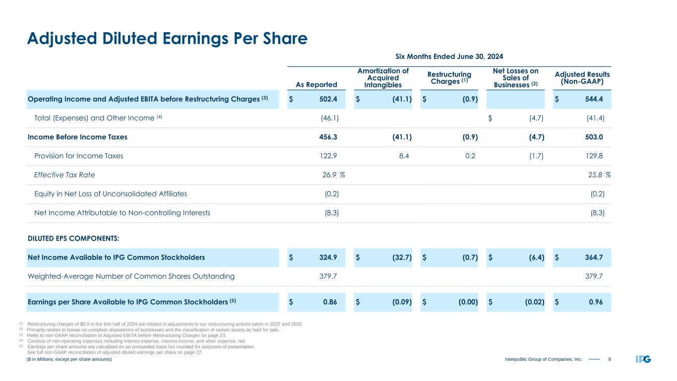 7Interpublic Group of Companies, Inc. Three Months Ended June 30, 2024 As Reported Amortization of Acquired Intangibles Restructuring Charges (1) Net Gains on Sales of Businesses (2) Adjusted Results (Non-GAAP) Operating Income and Adjusted EBITA before Restructuring Charges (3) $ 318.2 $ (20.4) $ (0.3) $ 338.9 Total (Expenses) and Other Income (4) (22.5) $ 2.1 (24.6) Income Before Income Taxes 295.7 (20.4) (0.3) 2.1 314.3 Provision for Income Taxes 75.6 4.2 0.1 (0.6) 79.3 Effective Tax Rate 25.6 % 25.2 % Equity in Net Loss of Unconsolidated Affiliates (0.5) (0.5) Net Income Attributable to Non-controlling Interests (5.1) (5.1) DILUTED EPS COMPONENTS: Net Income Available to IPG Common Stockholders $ 214.5 $ (16.2) $ (0.2) $ 1.5 $ 229.4 Weighted-Average Number of Common Shares Outstanding 378.7 378.7 Earnings per Share Available to IPG Common Stockholders (5) $ 0.57 $ (0.04) $ (0.00) $ 0.00 $ 0.61 ($ in Millions, except per share amounts) (1) Restructuring charges of $0.3 in the second quarter of 2024 are related to adjustments to our restructuring actions taken in 2022 and 2020. (2) Primarily relates to gains on complete dispositions of businesses and the classification of certain assets as held for sale. (3) Refer to non-GAAP reconciliation of Adjusted EBITA before Restructuring Charges on page 23. (4) Consists of non-operating expenses including interest expense, interest income, and other expense, net. (5) Earnings per share amounts are calculated on an unrounded basis but rounded for purposes of presentation. See full non-GAAP reconciliation of adjusted diluted earnings per share on page 21. Adjusted Diluted Earnings Per Share