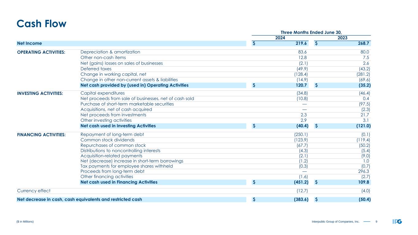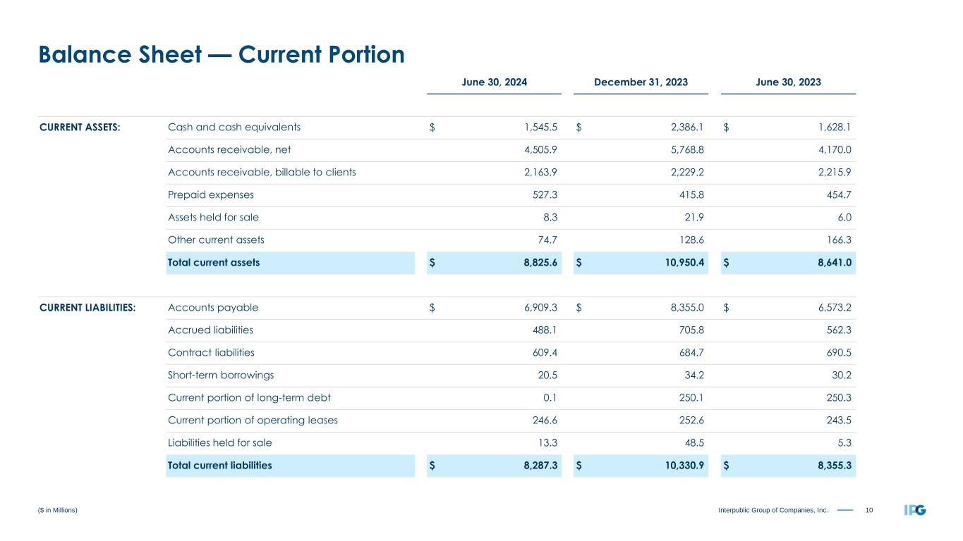 9Interpublic Group of Companies, Inc. Three Months Ended June 30, 2024 2023 Net Income $ 219.6 $ 268.7 OPERATING ACTIVITIES: Depreciation & amortization 83.6 80.0 Other non-cash items 12.8 7.5 Net (gains) losses on sales of businesses (2.1) 2.6 Deferred taxes (49.9) (43.2) Change in working capital, net (128.4) (281.2) Change in other non-current assets & liabilities (14.9) (69.6) Net cash provided by (used in) Operating Activities $ 120.7 $ (35.2) INVESTING ACTIVITIES: Capital expenditures (34.8) (46.4) Net proceeds from sale of businesses, net of cash sold (10.8) 0.4 Purchase of short-term marketable securities — (97.5) Acquisitions, net of cash acquired — (2.3) Net proceeds from investments 2.3 21.7 Other investing activities 2.9 3.1 Net cash used in Investing Activities $ (40.4) $ (121.0) FINANCING ACTIVITIES: Repayment of long-term debt (250.1) (0.1) Common stock dividends (123.9) (119.4) Repurchases of common stock (67.7) (50.2) Distributions to noncontrolling interests (4.3) (5.4) Acquisition-related payments (2.1) (9.0) Net (decrease) increase in short-term borrowings (1.2) 1.0 Tax payments for employee shares withheld (0.3) (0.7) Proceeds from long-term debt — 296.3 Other financing activities (1.6) (2.7) Net cash used in Financing Activities $ (451.2) $ 109.8 Currency effect (12.7) (4.0) Net decrease in cash, cash equivalents and restricted cash $ (383.6) $ (50.4) ($ in Millions) Cash Flow