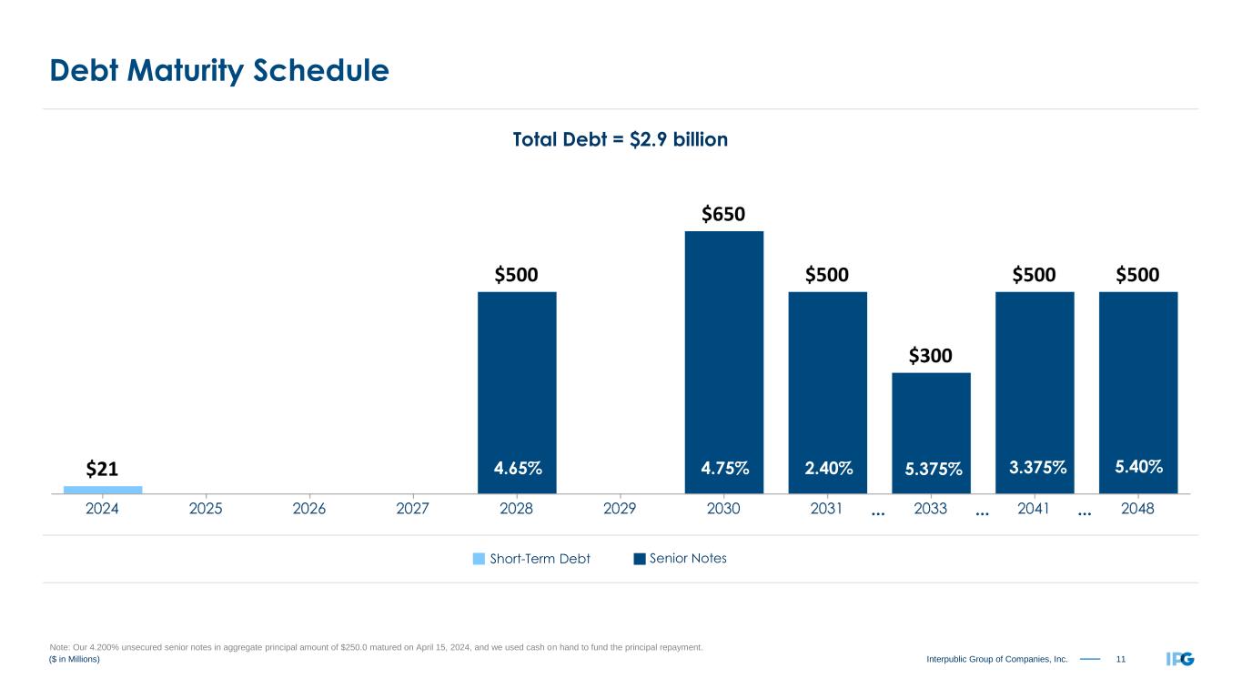 11Interpublic Group of Companies, Inc. Senior Notes 4.65% 5.40%2.40% Total Debt = $2.9 billion ($ in Millions) 4.75% 3.375% ... ... Short-Term Debt ... 5.375% Debt Maturity Schedule Note: Our 4.200% unsecured senior notes in aggregate principal amount of $250.0 matured on April 15, 2024, and we used cash on hand to fund the principal repayment.