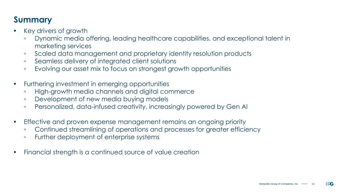 12Interpublic Group of Companies, Inc. Summary • Key drivers of growth ◦ Dynamic media offering, leading healthcare capabilities, and exceptional talent in marketing services ◦ Scaled data management and proprietary identity resolution products ◦ Seamless delivery of integrated client solutions ◦ Evolving our asset mix to focus on strongest growth opportunities • Furthering investment in emerging opportunities ◦ High-growth media channels and digital commerce ◦ Development of new media buying models ◦ Personalized, data-infused creativity, increasingly powered by Gen AI • Effective and proven expense management remains an ongoing priority ◦ Continued streamlining of operations and processes for greater efficiency ◦ Further deployment of enterprise systems • Financial strength is a continued source of value creation