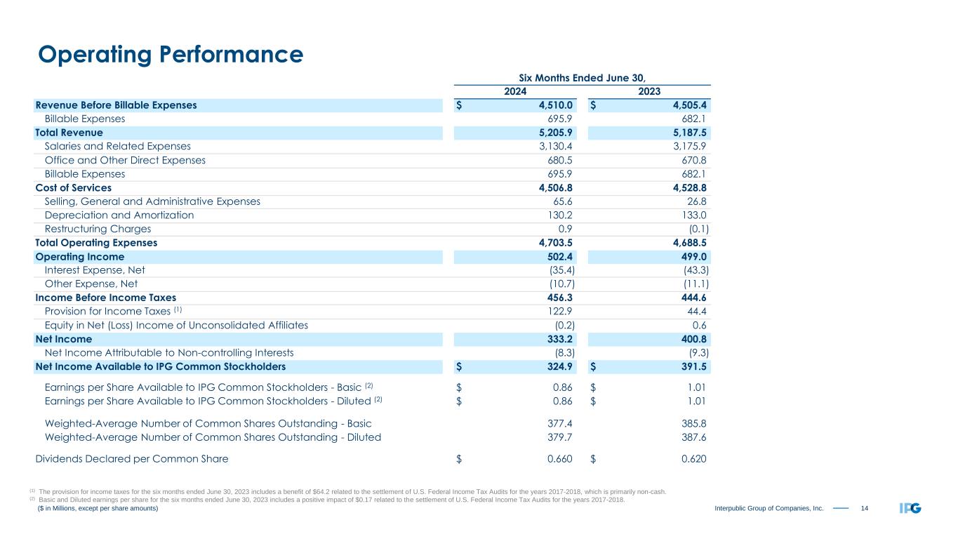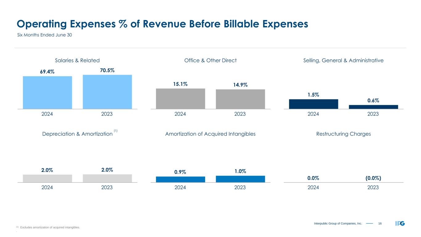 14Interpublic Group of Companies, Inc. Six Months Ended June 30, 2024 2023 Revenue Before Billable Expenses $ 4,510.0 $ 4,505.4 Billable Expenses 695.9 682.1 Total Revenue 5,205.9 5,187.5 Salaries and Related Expenses 3,130.4 3,175.9 Office and Other Direct Expenses 680.5 670.8 Billable Expenses 695.9 682.1 Cost of Services 4,506.8 4,528.8 Selling, General and Administrative Expenses 65.6 26.8 Depreciation and Amortization 130.2 133.0 Restructuring Charges 0.9 (0.1) Total Operating Expenses 4,703.5 4,688.5 Operating Income 502.4 499.0 Interest Expense, Net (35.4) (43.3) Other Expense, Net (10.7) (11.1) Income Before Income Taxes 456.3 444.6 Provision for Income Taxes (1) 122.9 44.4 Equity in Net (Loss) Income of Unconsolidated Affiliates (0.2) 0.6 Net Income 333.2 400.8 Net Income Attributable to Non-controlling Interests (8.3) (9.3) Net Income Available to IPG Common Stockholders $ 324.9 $ 391.5 Earnings per Share Available to IPG Common Stockholders - Basic (2) $ 0.86 $ 1.01 Earnings per Share Available to IPG Common Stockholders - Diluted (2) $ 0.86 $ 1.01 Weighted-Average Number of Common Shares Outstanding - Basic 377.4 385.8 Weighted-Average Number of Common Shares Outstanding - Diluted 379.7 387.6 Dividends Declared per Common Share $ 0.660 $ 0.620 ($ in Millions, except per share amounts) Operating Performance (1) The provision for income taxes for the six months ended June 30, 2023 includes a benefit of $64.2 related to the settlement of U.S. Federal Income Tax Audits for the years 2017-2018, which is primarily non-cash. (2) Basic and Diluted earnings per share for the six months ended June 30, 2023 includes a positive impact of $0.17 related to the settlement of U.S. Federal Income Tax Audits for the years 2017-2018.
