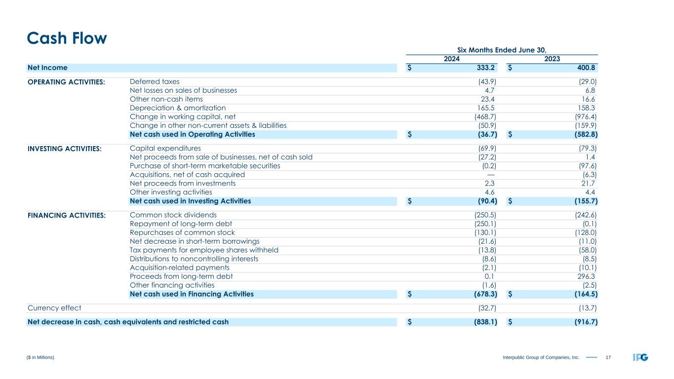 17Interpublic Group of Companies, Inc. Six Months Ended June 30, 2024 2023 Net Income $ 333.2 $ 400.8 OPERATING ACTIVITIES: Deferred taxes (43.9) (29.0) Net losses on sales of businesses 4.7 6.8 Other non-cash items 23.4 16.6 Depreciation & amortization 165.5 158.3 Change in working capital, net (468.7) (976.4) Change in other non-current assets & liabilities (50.9) (159.9) Net cash used in Operating Activities $ (36.7) $ (582.8) INVESTING ACTIVITIES: Capital expenditures (69.9) (79.3) Net proceeds from sale of businesses, net of cash sold (27.2) 1.4 Purchase of short-term marketable securities (0.2) (97.6) Acquisitions, net of cash acquired — (6.3) Net proceeds from investments 2.3 21.7 Other investing activities 4.6 4.4 Net cash used in Investing Activities $ (90.4) $ (155.7) FINANCING ACTIVITIES: Common stock dividends (250.5) (242.6) Repayment of long-term debt (250.1) (0.1) Repurchases of common stock (130.1) (128.0) Net decrease in short-term borrowings (21.6) (11.0) Tax payments for employee shares withheld (13.8) (58.0) Distributions to noncontrolling interests (8.6) (8.5) Acquisition-related payments (2.1) (10.1) Proceeds from long-term debt 0.1 296.3 Other financing activities (1.6) (2.5) Net cash used in Financing Activities $ (678.3) $ (164.5) Currency effect (32.7) (13.7) Net decrease in cash, cash equivalents and restricted cash $ (838.1) $ (916.7) ($ in Millions) Cash Flow