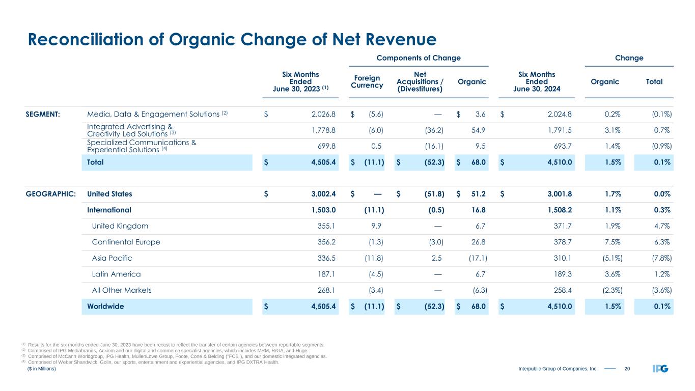 19Interpublic Group of Companies, Inc. Components of Change Change Three Months Ended June 30, 2023 (1) Foreign Currency Net Acquisitions / (Divestitures) Organic Three Months Ended June 30, 2024 Organic Total SEGMENT: Media, Data & Engagement Solutions (2) $ 1,060.9 $ (5.7) $ — $ 8.3 $ 1,063.5 0.8% 0.2% Integrated Advertising & Creativity Led Solutions (3) 908.3 (6.2) (19.4) 27.4 910.1 3.0% 0.2% Specialized Communications & Experiential Solutions (4) 359.3 (0.8) (9.5) 4.5 353.5 1.3% (1.6%) Total $ 2,328.5 $ (12.7) $ (28.9) $ 40.2 $ 2,327.1 1.7% (0.1%) GEOGRAPHIC: United States $ 1,531.8 $ — $ (25.9) $ 19.6 $ 1,525.5 1.3% (0.4%) International 796.7 (12.7) (3.0) 20.6 801.6 2.6% 0.6% United Kingdom 184.9 2.5 — 6.3 193.7 3.4% 4.8% Continental Europe 192.5 (2.5) (3.0) 12.2 199.2 6.3% 3.5% Asia Pacific 177.3 (5.8) — (4.2) 167.3 (2.4%) (5.6%) Latin America 102.4 (4.4) — 4.2 102.2 4.1% (0.2%) All Other Markets 139.6 (2.5) — 2.1 139.2 1.5% (0.3%) Worldwide $ 2,328.5 $ (12.7) $ (28.9) $ 40.2 $ 2,327.1 1.7% (0.1%) ($ in Millions) Reconciliation of Organic Change of Net Revenue (1) Results for the three months ended June 30, 2023 have been recast to reflect the transfer of certain agencies between reportable segments. (2) Comprised of IPG Mediabrands, Acxiom and our digital and commerce specialist agencies, which includes MRM, R/GA, and Huge. (3) Comprised of McCann Worldgroup, IPG Health, MullenLowe Group, Foote, Cone & Belding ("FCB"), and our domestic integrated agencies. (4) Comprised of Weber Shandwick, Golin, our sports, entertainment and experiential agencies, and IPG DXTRA Health.