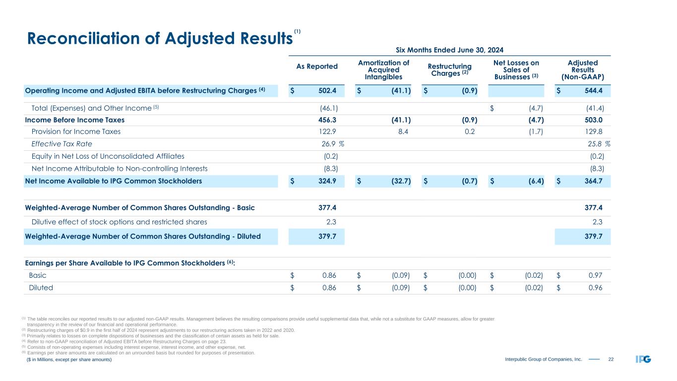 21Interpublic Group of Companies, Inc. Three Months Ended June 30, 2024 As Reported Amortization of Acquired Intangibles Restructuring Charges (2) Net Gains on Sales of Businesses (3) Adjusted Results (Non-GAAP) Operating Income and Adjusted EBITA before Restructuring Charges (4) $ 318.2 $ (20.4) $ (0.3) $ 338.9 Total (Expenses) and Other Income (5) (22.5) $ 2.1 (24.6) Income Before Income Taxes 295.7 (20.4) (0.3) 2.1 314.3 Provision for Income Taxes 75.6 4.2 0.1 (0.6) 79.3 Effective Tax Rate 25.6 % 25.2 % Equity in Net Loss of Unconsolidated Affiliates (0.5) (0.5) Net Income Attributable to Non-controlling Interests (5.1) (5.1) Net Income Available to IPG Common Stockholders $ 214.5 $ (16.2) $ (0.2) $ 1.5 $ 229.4 Weighted-Average Number of Common Shares Outstanding - Basic 376.3 376.3 Dilutive effect of stock options and restricted shares 2.4 2.4 Weighted-Average Number of Common Shares Outstanding - Diluted 378.7 378.7 Earnings per Share Available to IPG Common Stockholders (6): Basic $ 0.57 $ (0.04) $ (0.00) $ 0.00 $ 0.61 Diluted $ 0.57 $ (0.04) $ (0.00) $ 0.00 $ 0.61 ($ in Millions, except per share amounts) (1) The table reconciles our reported results to our adjusted non-GAAP results. Management believes the resulting comparisons provide useful supplemental data that, while not a substitute for GAAP measures, allow for greater transparency in the review of our financial and operational performance. (2) Restructuring charges of $0.3 in the second quarter of 2024 are related to adjustments to our restructuring actions taken 2022 and 2020. (3) Primarily relates to gains on complete dispositions of businesses and the classification of certain assets as held for sale. (4) Refer to non-GAAP reconciliation of Adjusted EBITA before Restructuring Charges on page 23. (5) Consists of non-operating expenses including interest expense, interest income, and other expense, net. (6) Earnings per share amounts are calculated on an unrounded basis but rounded for purposes of presentation. Reconciliation of Adjusted Results (1)