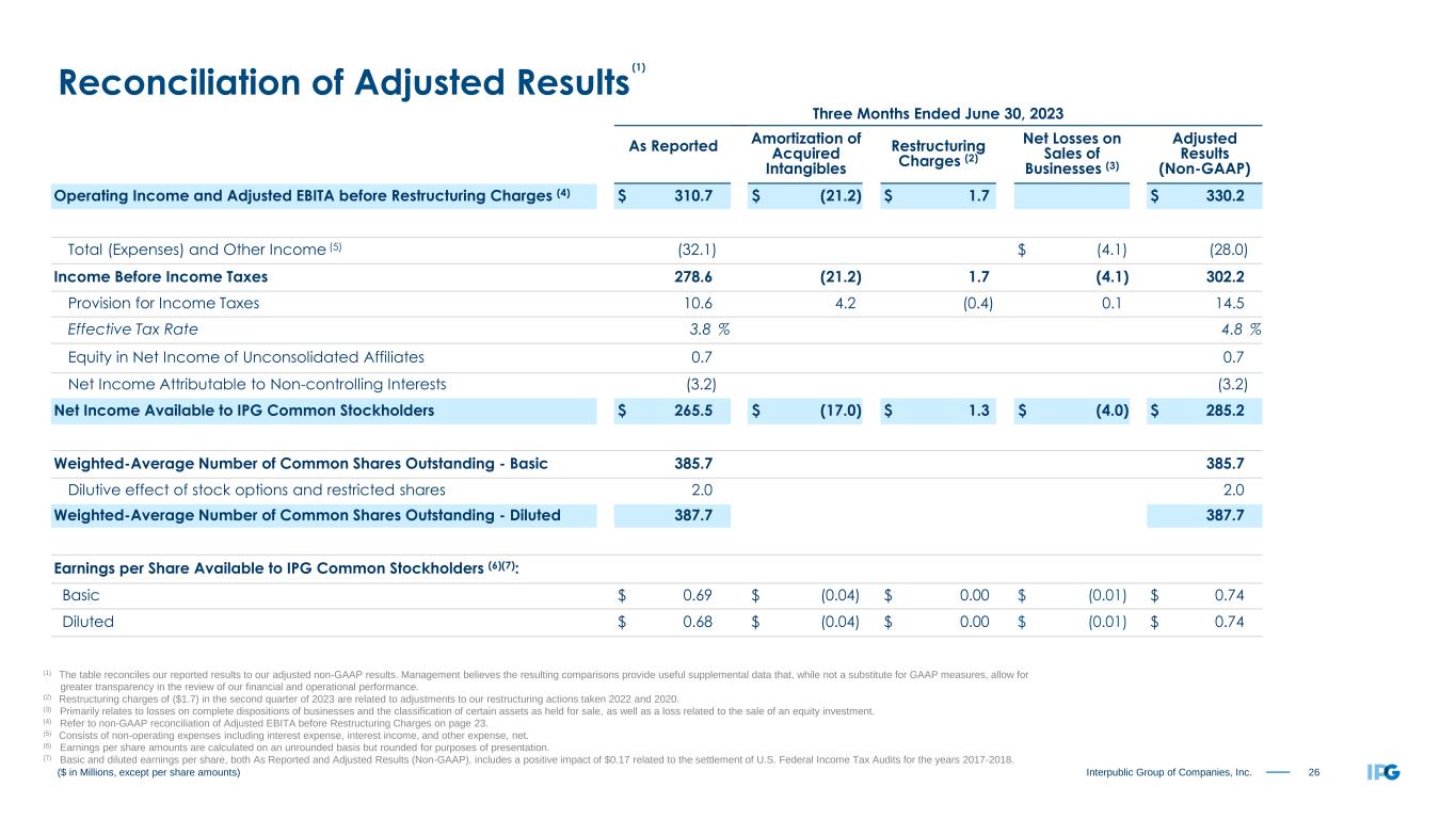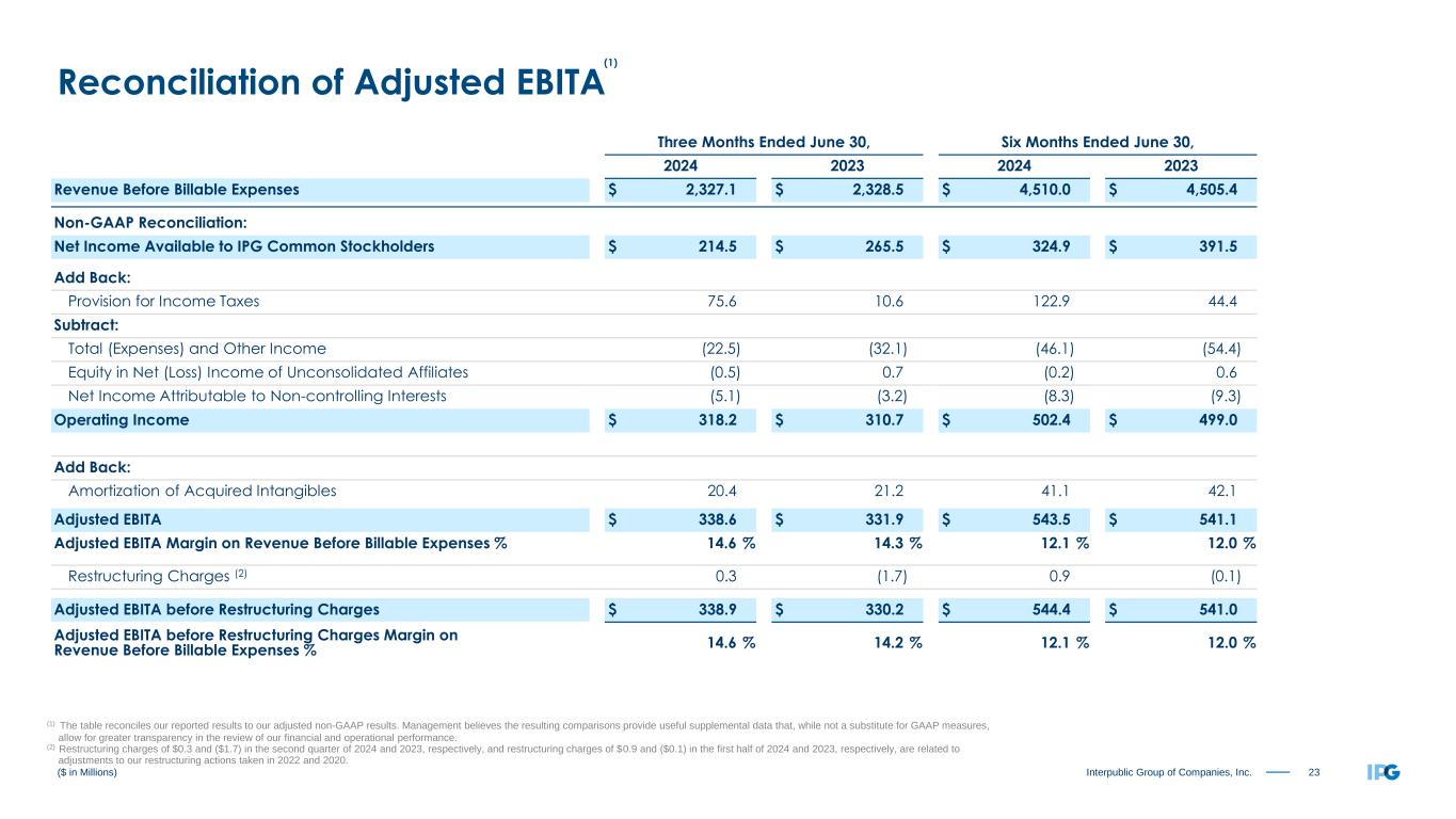 22Interpublic Group of Companies, Inc. ($ in Millions, except per share amounts) Reconciliation of Adjusted Results (1) (1) The table reconciles our reported results to our adjusted non-GAAP results. Management believes the resulting comparisons provide useful supplemental data that, while not a substitute for GAAP measures, allow for greater transparency in the review of our financial and operational performance. (2) Restructuring charges of $0.9 in the first half of 2024 represent adjustments to our restructuring actions taken in 2022 and 2020. (3) Primarily relates to losses on complete dispositions of businesses and the classification of certain assets as held for sale. (4) Refer to non-GAAP reconciliation of Adjusted EBITA before Restructuring Charges on page 23. (5) Consists of non-operating expenses including interest expense, interest income, and other expense, net. (6) Earnings per share amounts are calculated on an unrounded basis but rounded for purposes of presentation. Six Months Ended June 30, 2024 As Reported Amortization of Acquired Intangibles Restructuring Charges (2) Net Losses on Sales of Businesses (3) Adjusted Results (Non-GAAP) Operating Income and Adjusted EBITA before Restructuring Charges (4) $ 502.4 $ (41.1) $ (0.9) $ 544.4 Total (Expenses) and Other Income (5) (46.1) $ (4.7) (41.4) Income Before Income Taxes 456.3 (41.1) (0.9) (4.7) 503.0 Provision for Income Taxes 122.9 8.4 0.2 (1.7) 129.8 Effective Tax Rate 26.9 % 25.8 % Equity in Net Loss of Unconsolidated Affiliates (0.2) (0.2) Net Income Attributable to Non-controlling Interests (8.3) (8.3) Net Income Available to IPG Common Stockholders $ 324.9 $ (32.7) $ (0.7) $ (6.4) $ 364.7 Weighted-Average Number of Common Shares Outstanding - Basic 377.4 377.4 Dilutive effect of stock options and restricted shares 2.3 2.3 Weighted-Average Number of Common Shares Outstanding - Diluted 379.7 379.7 Earnings per Share Available to IPG Common Stockholders (6): Basic $ 0.86 $ (0.09) $ (0.00) $ (0.02) $ 0.97 Diluted $ 0.86 $ (0.09) $ (0.00) $ (0.02) $ 0.96
