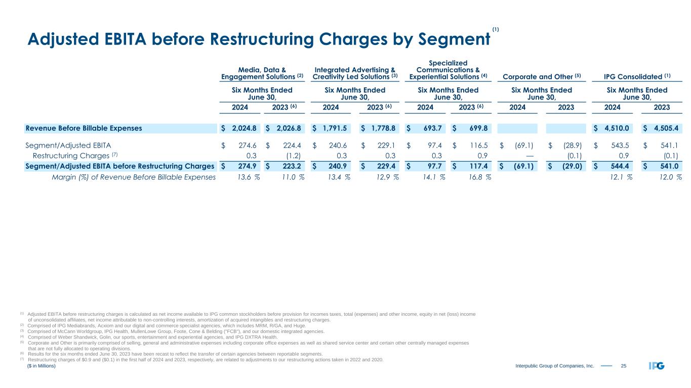 24Interpublic Group of Companies, Inc. Media, Data & Engagement Solutions (2) Integrated Advertising & Creativity Led Solutions (3) Specialized Communications & Experiential Solutions (4) Corporate and Other (5) IPG Consolidated (1) Three Months Ended June 30, Three Months Ended June 30, Three Months Ended June 30, Three Months Ended June 30, Three Months Ended June 30, 2024 2023 (6) 2024 2023 (6) 2024 2023 (6) 2024 2023 2024 2023 Revenue Before Billable Expenses $ 1,063.5 $ 1,060.9 $ 910.1 $ 908.3 $ 353.5 $ 359.3 $ 2,327.1 $ 2,328.5 Segment/Adjusted EBITA $ 181.4 $ 144.6 $ 132.7 $ 131.0 $ 53.5 $ 71.3 $ (29.0) $ (15.0) $ 338.6 $ 331.9 Restructuring Charges (7) 0.3 (1.2) — — — (0.4) — (0.1) 0.3 (1.7) Segment/Adjusted EBITA before Restructuring Charges $ 181.7 $ 143.4 $ 132.7 $ 131.0 $ 53.5 $ 70.9 $ (29.0) $ (15.1) $ 338.9 $ 330.2 Margin (%) of Revenue Before Billable Expenses 17.1 % 13.5 % 14.6 % 14.4 % 15.1 % 19.7 % 14.6 % 14.2 % ($ in Millions) (1) Adjusted EBITA before restructuring charges is calculated as net income available to IPG common stockholders before provision for incomes taxes, total (expenses) and other income, equity in net (loss) income of unconsolidated affiliates, net income attributable to non-controlling interests, amortization of acquired intangibles and restructuring charges. (2) Comprised of IPG Mediabrands, Acxiom and our digital and commerce specialist agencies, which includes MRM, R/GA, and Huge. (3) Comprised of McCann Worldgroup, IPG Health, MullenLowe Group, Foote, Cone & Belding ("FCB"), and our domestic integrated agencies. (4) Comprised of Weber Shandwick, Golin, our sports, entertainment and experiential agencies, and IPG DXTRA Health. (5) Corporate and Other is primarily comprised of selling, general and administrative expenses including corporate office expenses as well as shared service center and certain other centrally managed expenses that are not fully allocated to operating divisions. (6) Results for the three months ended June 30, 2023 have been recast to reflect the transfer of certain agencies between reportable segments. (7) Restructuring charges of $0.3 and ($1.7) in the second quarter of 2024 and 2023, respectively, are related to adjustments to our restructuring actions taken in 2022 and 2020. Adjusted EBITA before Restructuring Charges by Segment (1)