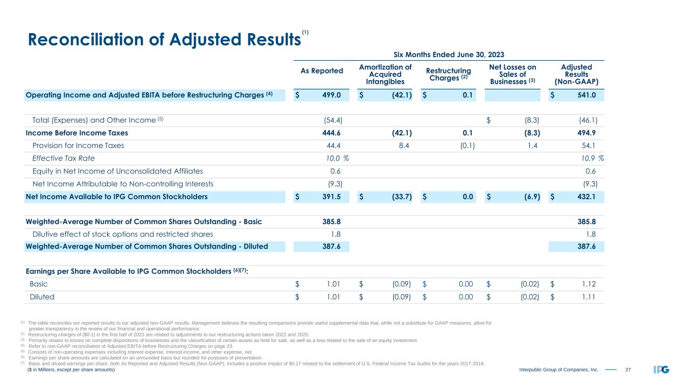 26Interpublic Group of Companies, Inc. Three Months Ended June 30, 2023 As Reported Amortization of Acquired Intangibles Restructuring Charges (2) Net Losses on Sales of Businesses (3) Adjusted Results (Non-GAAP) Operating Income and Adjusted EBITA before Restructuring Charges (4) $ 310.7 $ (21.2) $ 1.7 $ 330.2 Total (Expenses) and Other Income (5) (32.1) $ (4.1) (28.0) Income Before Income Taxes 278.6 (21.2) 1.7 (4.1) 302.2 Provision for Income Taxes 10.6 4.2 (0.4) 0.1 14.5 Effective Tax Rate 3.8 % 4.8 % Equity in Net Income of Unconsolidated Affiliates 0.7 0.7 Net Income Attributable to Non-controlling Interests (3.2) (3.2) Net Income Available to IPG Common Stockholders $ 265.5 $ (17.0) $ 1.3 $ (4.0) $ 285.2 Weighted-Average Number of Common Shares Outstanding - Basic 385.7 385.7 Dilutive effect of stock options and restricted shares 2.0 2.0 Weighted-Average Number of Common Shares Outstanding - Diluted 387.7 387.7 Earnings per Share Available to IPG Common Stockholders (6)(7): Basic $ 0.69 $ (0.04) $ 0.00 $ (0.01) $ 0.74 Diluted $ 0.68 $ (0.04) $ 0.00 $ (0.01) $ 0.74 ($ in Millions, except per share amounts) (1) The table reconciles our reported results to our adjusted non-GAAP results. Management believes the resulting comparisons provide useful supplemental data that, while not a substitute for GAAP measures, allow for greater transparency in the review of our financial and operational performance. (2) Restructuring charges of ($1.7) in the second quarter of 2023 are related to adjustments to our restructuring actions taken 2022 and 2020. (3) Primarily relates to losses on complete dispositions of businesses and the classification of certain assets as held for sale, as well as a loss related to the sale of an equity investment. (4) Refer to non-GAAP reconciliation of Adjusted EBITA before Restructuring Charges on page 23. (5) Consists of non-operating expenses including interest expense, interest income, and other expense, net. (6) Earnings per share amounts are calculated on an unrounded basis but rounded for purposes of presentation. (7) Basic and diluted earnings per share, both As Reported and Adjusted Results (Non-GAAP), includes a positive impact of $0.17 related to the settlement of U.S. Federal Income Tax Audits for the years 2017-2018. Reconciliation of Adjusted Results (1)
