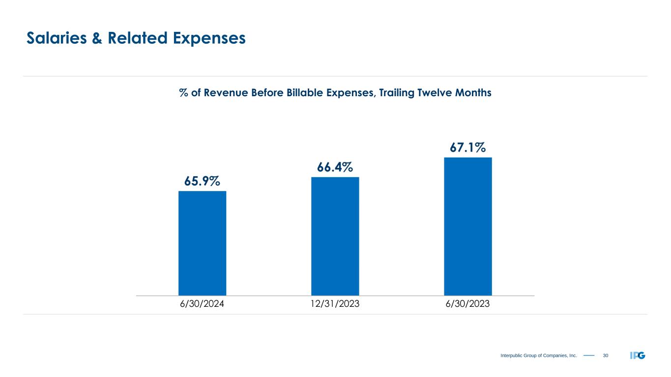 29Interpublic Group of Companies, Inc. Metrics Update CATEGORY: SALARIES & RELATED OFFICE & OTHER DIRECT FINANCIAL (% of Revenue Before Billable Expenses) (% of Revenue Before Billable Expenses) METRIC: Trailing Twelve Months Trailing Twelve Months Available Liquidity Base, Benefits & Tax Occupancy Expense Credit Facility Covenant Incentive Expense All Other Office & Other Direct Expenses Severance Expense Temporary Help