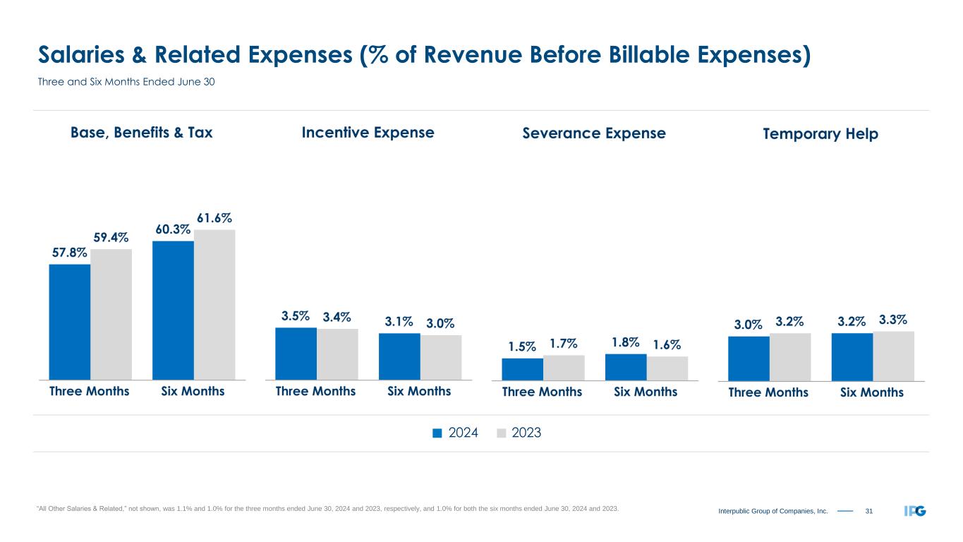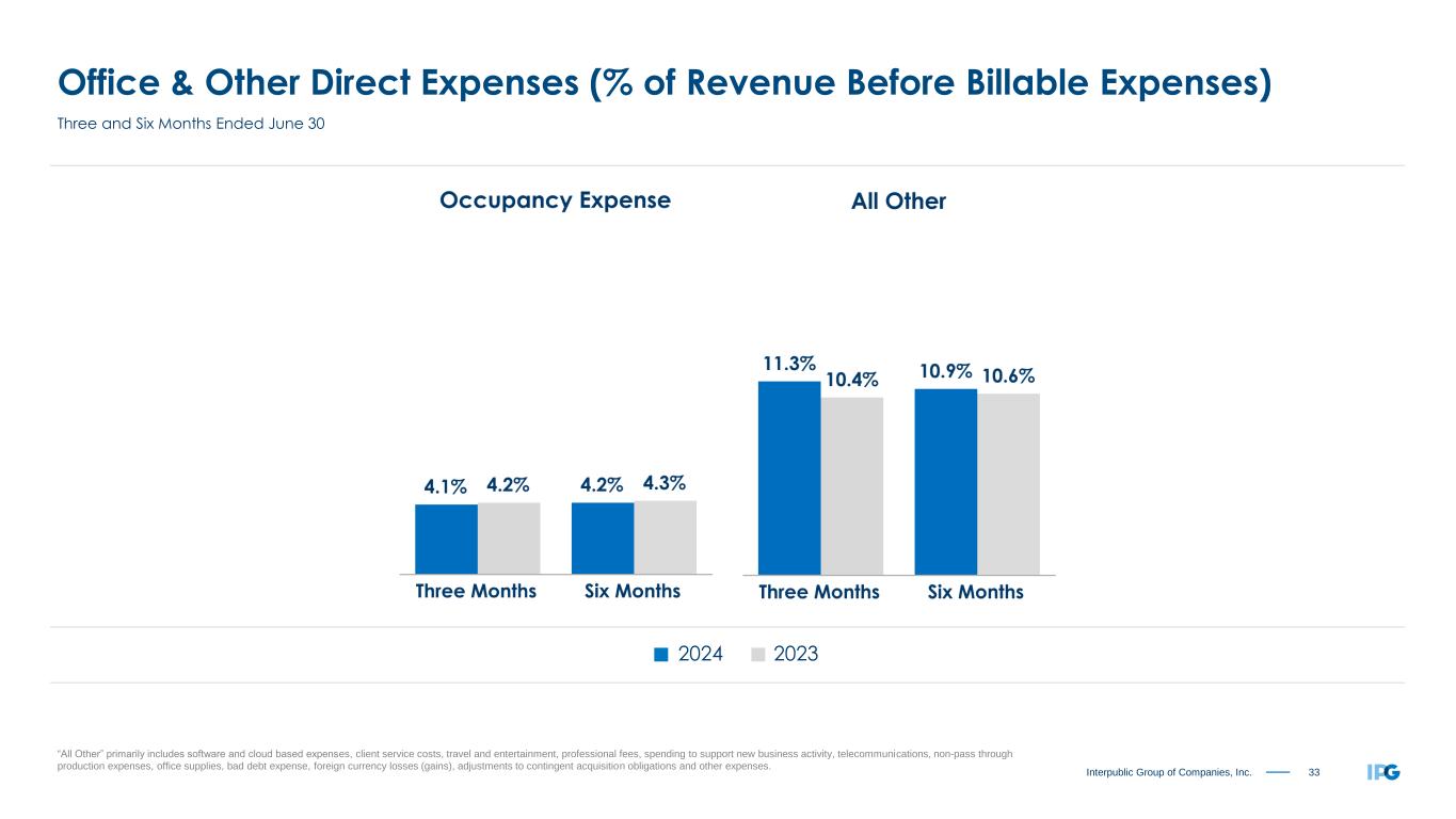 33Interpublic Group of Companies, Inc. Office & Other Direct Expenses (% of Revenue Before Billable Expenses) “All Other” primarily includes software and cloud based expenses, client service costs, travel and entertainment, professional fees, spending to support new business activity, telecommunications, non-pass through production expenses, office supplies, bad debt expense, foreign currency losses (gains), adjustments to contingent acquisition obligations and other expenses. 2024 2023 Three and Six Months Ended June 30