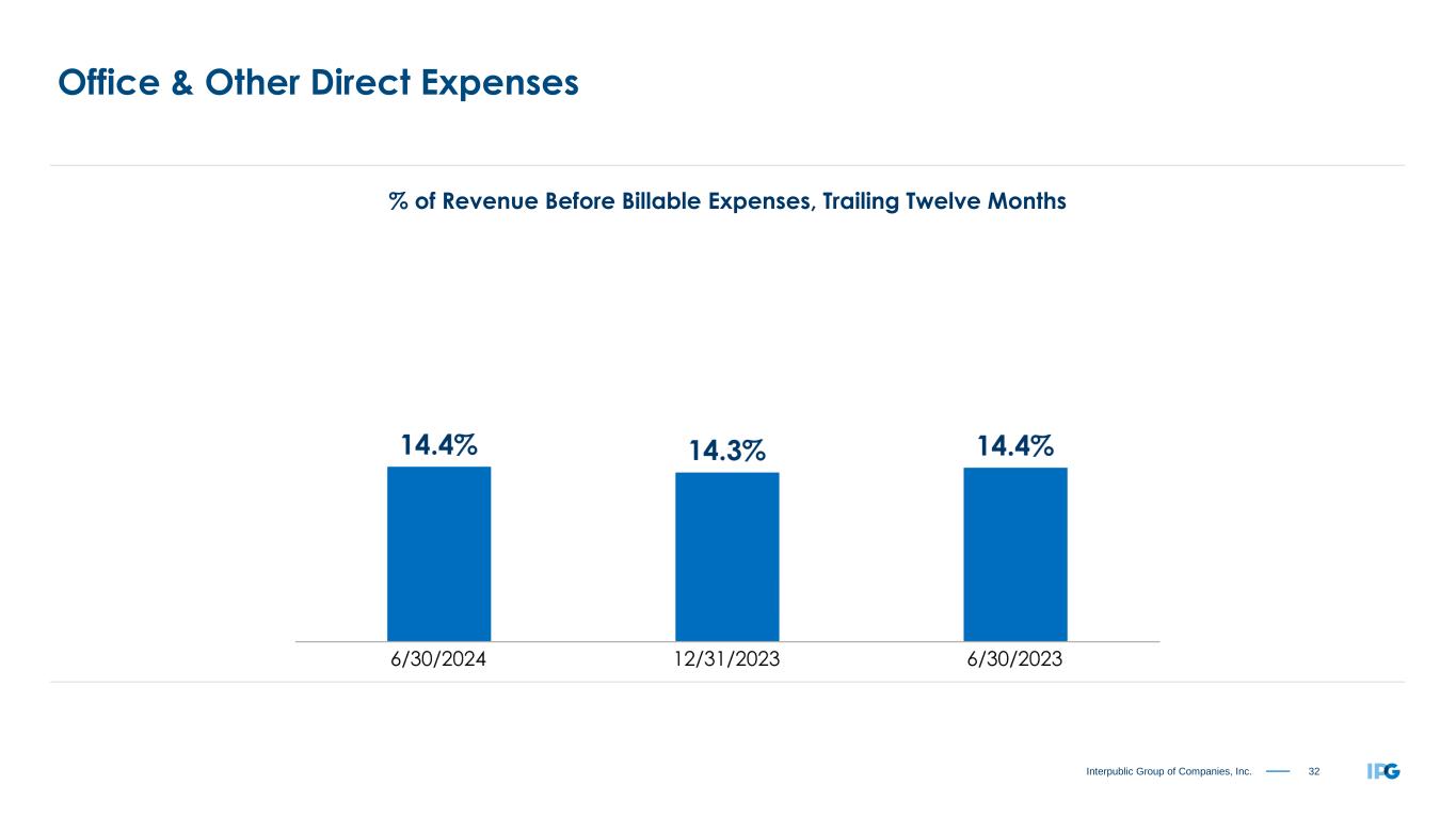 31Interpublic Group of Companies, Inc. Salaries & Related Expenses (% of Revenue Before Billable Expenses) “All Other Salaries & Related,” not shown, was 1.1% and 1.0% for the three months ended June 30, 2024 and 2023, respectively, and 1.0% for both the six months ended June 30, 2024 and 2023. Three and Six Months Ended June 30 2024 2023