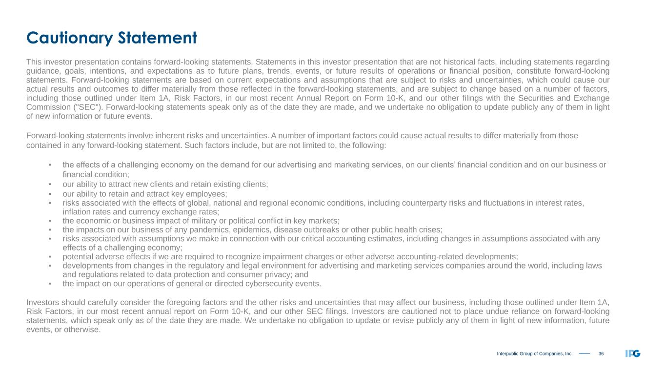 36Interpublic Group of Companies, Inc. Cautionary Statement This investor presentation contains forward-looking statements. Statements in this investor presentation that are not historical facts, including statements regarding guidance, goals, intentions, and expectations as to future plans, trends, events, or future results of operations or financial position, constitute forward-looking statements. Forward-looking statements are based on current expectations and assumptions that are subject to risks and uncertainties, which could cause our actual results and outcomes to differ materially from those reflected in the forward-looking statements, and are subject to change based on a number of factors, including those outlined under Item 1A, Risk Factors, in our most recent Annual Report on Form 10-K, and our other filings with the Securities and Exchange Commission ("SEC"). Forward-looking statements speak only as of the date they are made, and we undertake no obligation to update publicly any of them in light of new information or future events. Forward-looking statements involve inherent risks and uncertainties. A number of important factors could cause actual results to differ materially from those contained in any forward-looking statement. Such factors include, but are not limited to, the following: ▪ the effects of a challenging economy on the demand for our advertising and marketing services, on our clients’ financial condition and on our business or financial condition; ▪ our ability to attract new clients and retain existing clients; ▪ our ability to retain and attract key employees; ▪ risks associated with the effects of global, national and regional economic conditions, including counterparty risks and fluctuations in interest rates, inflation rates and currency exchange rates; ▪ the economic or business impact of military or political conflict in key markets; ▪ the impacts on our business of any pandemics, epidemics, disease outbreaks or other public health crises; ▪ risks associated with assumptions we make in connection with our critical accounting estimates, including changes in assumptions associated with any effects of a challenging economy; ▪ potential adverse effects if we are required to recognize impairment charges or other adverse accounting-related developments; ▪ developments from changes in the regulatory and legal environment for advertising and marketing services companies around the world, including laws and regulations related to data protection and consumer privacy; and ▪ the impact on our operations of general or directed cybersecurity events. Investors should carefully consider the foregoing factors and the other risks and uncertainties that may affect our business, including those outlined under Item 1A, Risk Factors, in our most recent annual report on Form 10-K, and our other SEC filings. Investors are cautioned not to place undue reliance on forward-looking statements, which speak only as of the date they are made. We undertake no obligation to update or revise publicly any of them in light of new information, future events, or otherwise.