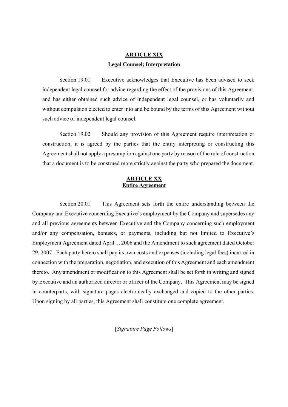 ARTICLE XIX Legal Counsel; Interpretation Section 19.01 Executive acknowledges that Executive has been advised to seek independent legal counsel for advice regarding the effect of the provisions of this Agreement, and has either obtained such advice of independent legal counsel, or has voluntarily and without compulsion elected to enter into and be bound by the terms of this Agreement without such advice of independent legal counsel. Section 19.02 Should any provision of this Agreement require interpretation or construction, it is agreed by the parties that the entity interpreting or constructing this Agreement shall not apply a presumption against one party by reason of the rule of construction that a document is to be construed more strictly against the party who prepared the document. ARTICLE XX Entire Agreement Section 20.01 This Agreement sets forth the entire understanding between the Company and Executive concerning Executive’s employment by the Company and supersedes any and all previous agreements between Executive and the Company concerning such employment and/or any compensation, bonuses, or payments, including but not limited to Executive’s Employment Agreement dated April 1, 2006 and the Amendment to such agreement dated October 29, 2007. Each party hereto shall pay its own costs and expenses (including legal fees) incurred in connection with the preparation, negotiation, and execution of this Agreement and each amendment thereto. Any amendment or modification to this Agreement shall be set forth in writing and signed by Executive and an authorized director or officer of the Company. This Agreement may be signed in counterparts, with signature pages electronically exchanged and copied to the other parties. Upon signing by all parties, this Agreement shall constitute one complete agreement. [Signature Page Follows]