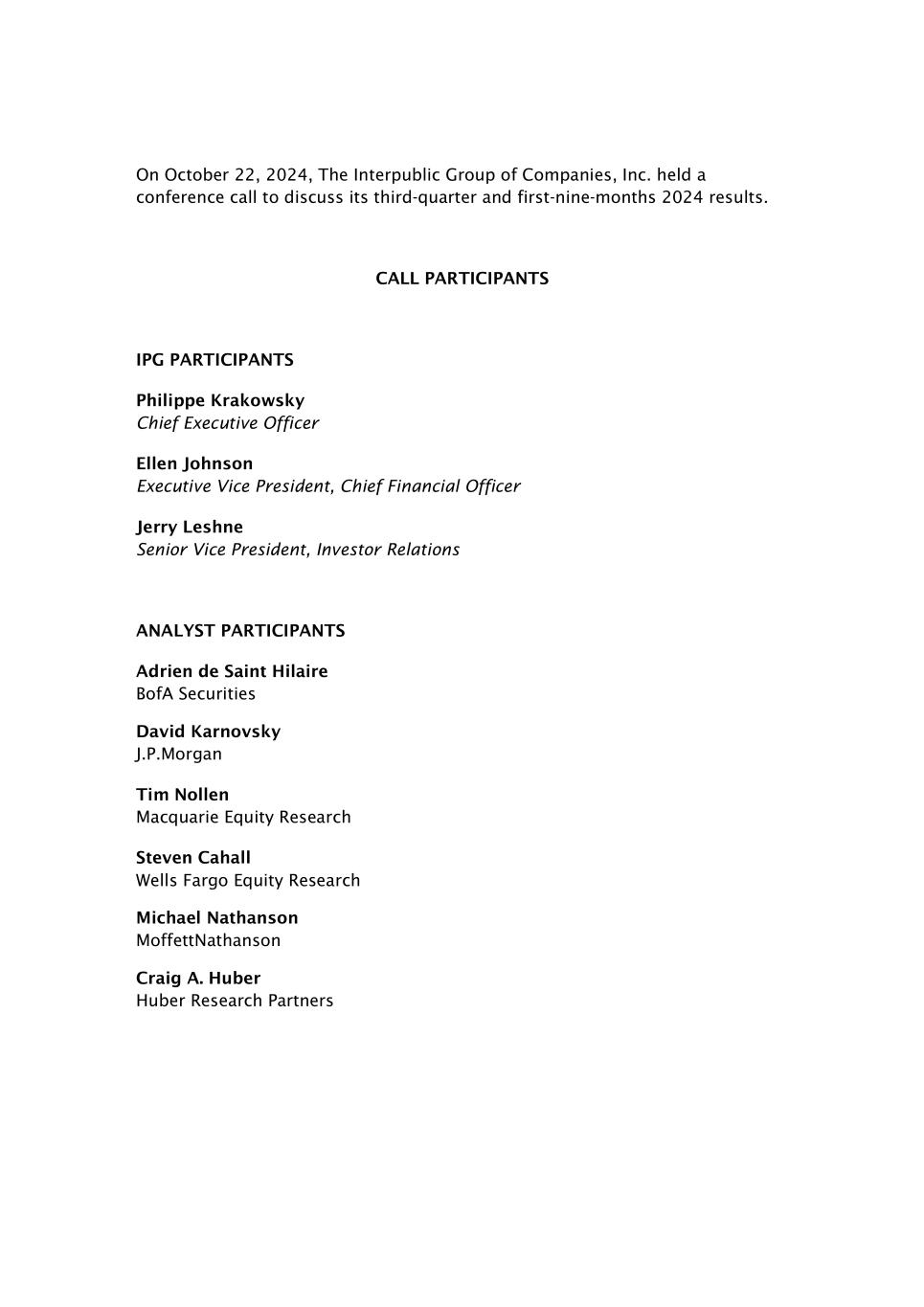 On October 22, 2024, The Interpublic Group of Companies, Inc. held a conference call to discuss its third-quarter and first-nine-months 2024 results. CALL PARTICIPANTS IPG PARTICIPANTS Philippe Krakowsky Chief Executive Officer Ellen Johnson Executive Vice President, Chief Financial Officer Jerry Leshne Senior Vice President, Investor Relations ANALYST PARTICIPANTS Adrien de Saint Hilaire BofA Securities David Karnovsky J.P.Morgan Tim Nollen Macquarie Equity Research Steven Cahall Wells Fargo Equity Research Michael Nathanson MoffettNathanson Craig A. Huber Huber Research Partners