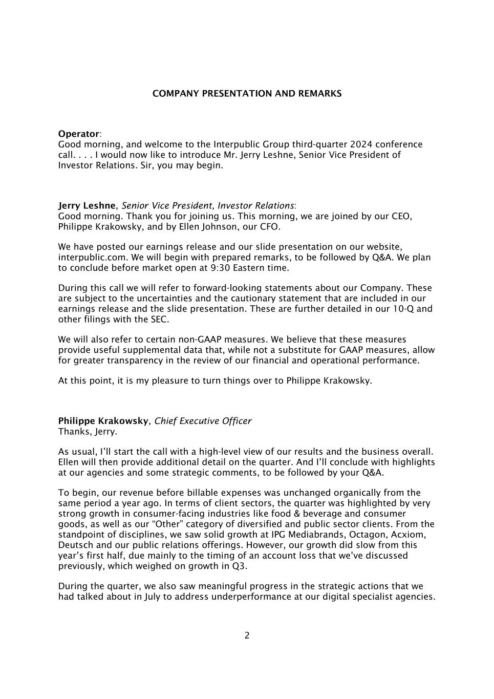 2 COMPANY PRESENTATION AND REMARKS Operator: Good morning, and welcome to the Interpublic Group third-quarter 2024 conference call. . . . I would now like to introduce Mr. Jerry Leshne, Senior Vice President of Investor Relations. Sir, you may begin. Jerry Leshne, Senior Vice President, Investor Relations: Good morning. Thank you for joining us. This morning, we are joined by our CEO, Philippe Krakowsky, and by Ellen Johnson, our CFO. We have posted our earnings release and our slide presentation on our website, interpublic.com. We will begin with prepared remarks, to be followed by Q&A. We plan to conclude before market open at 9:30 Eastern time. During this call we will refer to forward-looking statements about our Company. These are subject to the uncertainties and the cautionary statement that are included in our earnings release and the slide presentation. These are further detailed in our 10-Q and other filings with the SEC. We will also refer to certain non-GAAP measures. We believe that these measures provide useful supplemental data that, while not a substitute for GAAP measures, allow for greater transparency in the review of our financial and operational performance. At this point, it is my pleasure to turn things over to Philippe Krakowsky. Philippe Krakowsky, Chief Executive Officer Thanks, Jerry. As usual, I’ll start the call with a high-level view of our results and the business overall. Ellen will then provide additional detail on the quarter. And I’ll conclude with highlights at our agencies and some strategic comments, to be followed by your Q&A. To begin, our revenue before billable expenses was unchanged organically from the same period a year ago. In terms of client sectors, the quarter was highlighted by very strong growth in consumer-facing industries like food & beverage and consumer goods, as well as our “Other” category of diversified and public sector clients. From the standpoint of disciplines, we saw solid growth at IPG Mediabrands, Octagon, Acxiom, Deutsch and our public relations offerings. However, our growth did slow from this year’s first half, due mainly to the timing of an account loss that we’ve discussed previously, which weighed on growth in Q3. During the quarter, we also saw meaningful progress in the strategic actions that we had talked about in July to address underperformance at our digital specialist agencies.