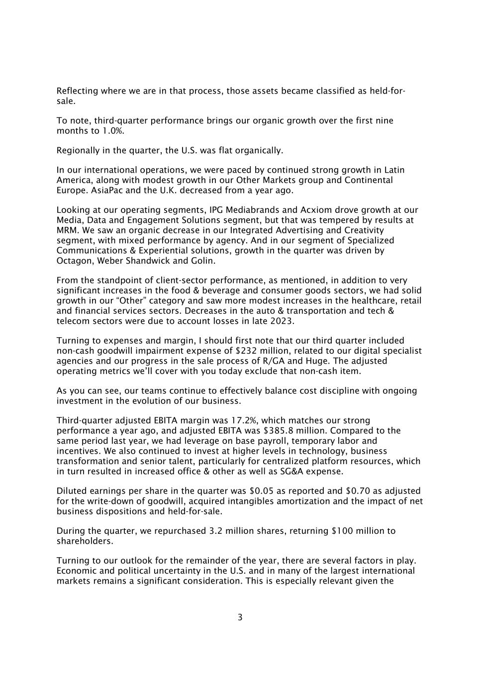 3 Reflecting where we are in that process, those assets became classified as held-for- sale. To note, third-quarter performance brings our organic growth over the first nine months to 1.0%. Regionally in the quarter, the U.S. was flat organically. In our international operations, we were paced by continued strong growth in Latin America, along with modest growth in our Other Markets group and Continental Europe. AsiaPac and the U.K. decreased from a year ago. Looking at our operating segments, IPG Mediabrands and Acxiom drove growth at our Media, Data and Engagement Solutions segment, but that was tempered by results at MRM. We saw an organic decrease in our Integrated Advertising and Creativity segment, with mixed performance by agency. And in our segment of Specialized Communications & Experiential solutions, growth in the quarter was driven by Octagon, Weber Shandwick and Golin. From the standpoint of client-sector performance, as mentioned, in addition to very significant increases in the food & beverage and consumer goods sectors, we had solid growth in our “Other” category and saw more modest increases in the healthcare, retail and financial services sectors. Decreases in the auto & transportation and tech & telecom sectors were due to account losses in late 2023. Turning to expenses and margin, I should first note that our third quarter included non-cash goodwill impairment expense of $232 million, related to our digital specialist agencies and our progress in the sale process of R/GA and Huge. The adjusted operating metrics we’ll cover with you today exclude that non-cash item. As you can see, our teams continue to effectively balance cost discipline with ongoing investment in the evolution of our business. Third-quarter adjusted EBITA margin was 17.2%, which matches our strong performance a year ago, and adjusted EBITA was $385.8 million. Compared to the same period last year, we had leverage on base payroll, temporary labor and incentives. We also continued to invest at higher levels in technology, business transformation and senior talent, particularly for centralized platform resources, which in turn resulted in increased office & other as well as SG&A expense. Diluted earnings per share in the quarter was $0.05 as reported and $0.70 as adjusted for the write-down of goodwill, acquired intangibles amortization and the impact of net business dispositions and held-for-sale. During the quarter, we repurchased 3.2 million shares, returning $100 million to shareholders. Turning to our outlook for the remainder of the year, there are several factors in play. Economic and political uncertainty in the U.S. and in many of the largest international markets remains a significant consideration. This is especially relevant given the